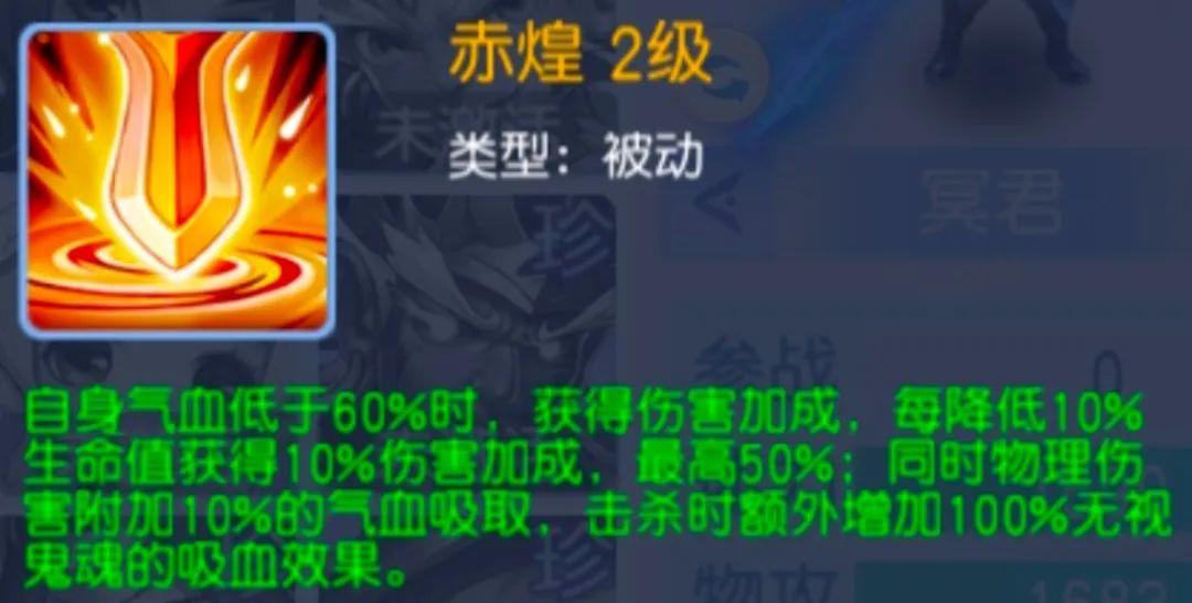 大家可以关注一下冥君的天赋被动技能。当气血低于60%时,它会获得伤害加成,每降低10%生命值,伤害加成提升10%,最高可达50%。
