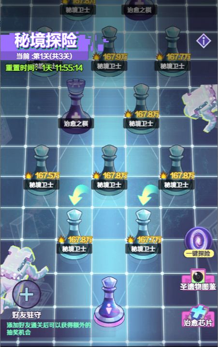 8.在开服一定天数之后到达一定等级获得一个彩色圣遗物之后可以解锁一键探险,快速探索秘境中的奖励。