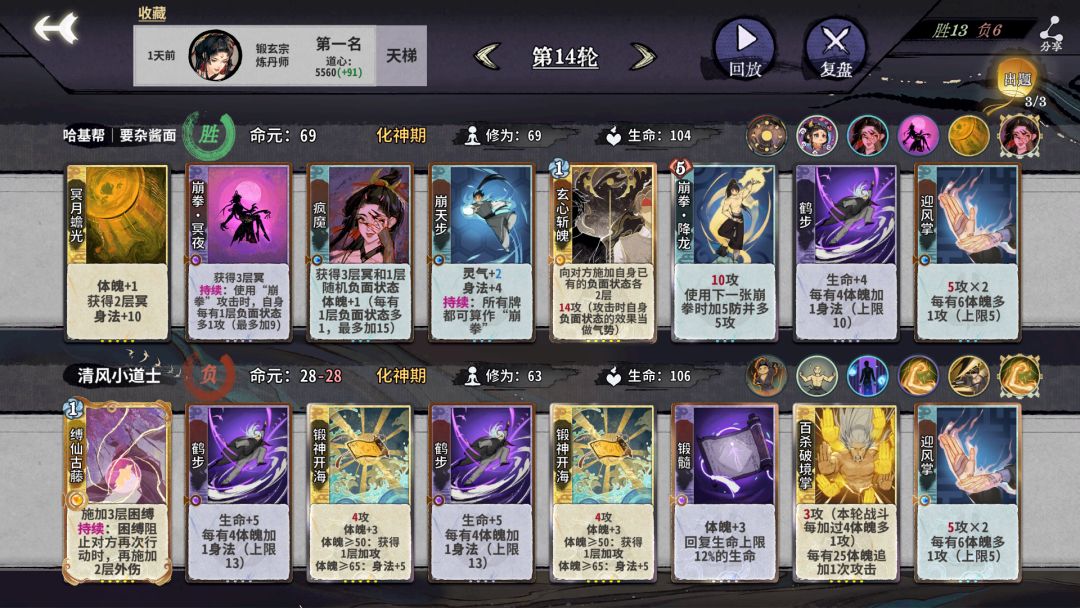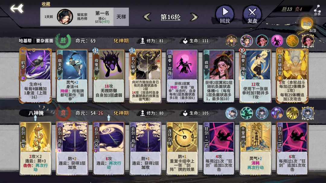 崩天要二级的另一个理由是能和满级鹤布搭配打一个二动虚弱斩的一圈杀。在对抗符万法(或者任何能先手四动你的卡组),特别是对面有高级游龙护体丹挡不住的时候这招很有用。