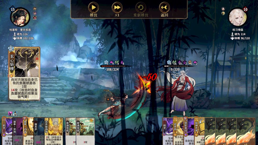 稍微讲讲过渡。前期正常d个两轮然后金丹大d找降龙崩天迎风掌之类的。驱邪丹这张卡非常好用,在金丹时又能抗伤害又能清冥加大量血量。金丹如果没有崩天迎风这些卡可以无脑全部d完,反正元婴没有什么特别需要的卡而且没迎风崩天上元婴我们也难赢。崩天步这张卡最好能二级,这样化神初期没有百杀(有斩魄)时第二圈的斩魄吃两圈疯魔基本也能杀人。可能有些道友没那么熟悉斩魄在abb崩天体系里的数值,我来讲讲为啥伤害是很恐怖的:斩魄用负面状态当气势,冥夜用负面当加攻,等于是负面状态又能当气势又能当加攻。比如下图的斩,第一圈打了54伤害,第二圈造成65伤害!直接14轮入对面28血带走了。