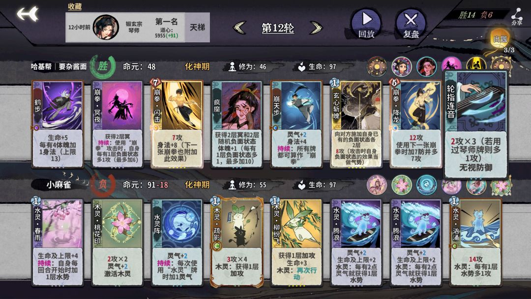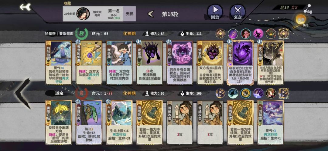 锻玄少的时候琴毒对大部分卡组都有一战之力,具体怎么打我就不说了毕竟已经有了很多攻略。主要分享一下这两个共鸣。阴晴圆缺提的质量是肉眼可见的高,虽然说不上把把三十身法但修罗吼斩魄等必要组件基本都有。另外阴晴圆缺前期基本必先手加上五轮能满牌修为上金丹也是非常的香。没有阴晴圆缺的abb五轮上本锻体没牌d基本要亏一波容错,阴晴圆缺解决了这个问题。