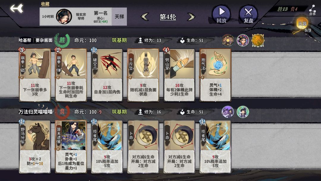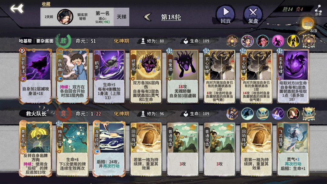 玩琴拿冥夜基本只有场上对局压力非常大而且崩天套来的比较齐才会考虑,我有好几次拿了冥夜都是元婴用了一次就再也没用过。极端的情况下化神初期可以模仿疯魔百杀的牌型用冥夜过渡,如下图: