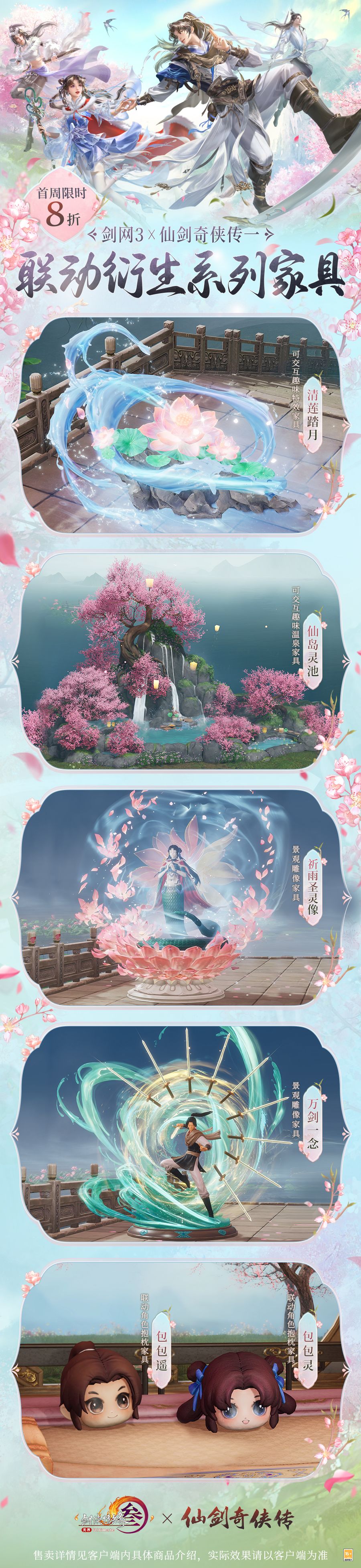 剑芒如风掀狂涛,万剑齐发,剑气所向地裂天崩!景观雕像家具“万剑一念”以竹冰晶质感拟周身剑气,蓄势待发,罡气纵横!更有可进行交互的趣味家具“清莲踏月”。清波送莲来,碧蓝水波似游龙,托芙蓉出水,风起时似有香风拂过,悠然自在。多款全新联动衍生系列家具登场,首周可限时享受8折优惠,一起来看看吧!