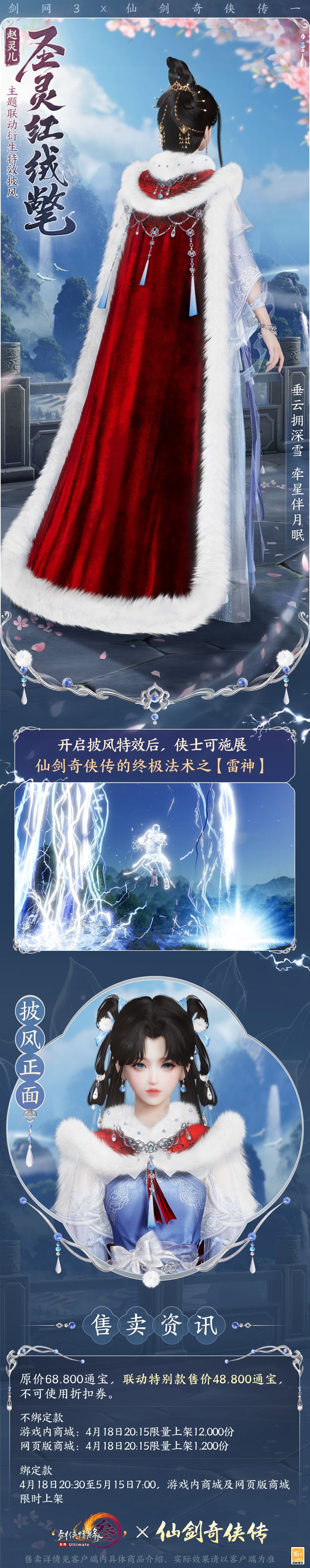 垂云拥深雪,牵星伴月眠,《剑网3》×《仙剑奇侠传一》联动衍生特效披风“圣灵红绒氅”神秘登场,联动特别款售价48,800通宝!似雪软毛围边,朱红微光长缎,宝珠系缠流苏银饰,点亮如火丝绒,雍容大气!