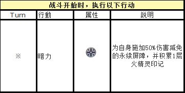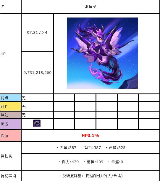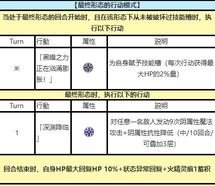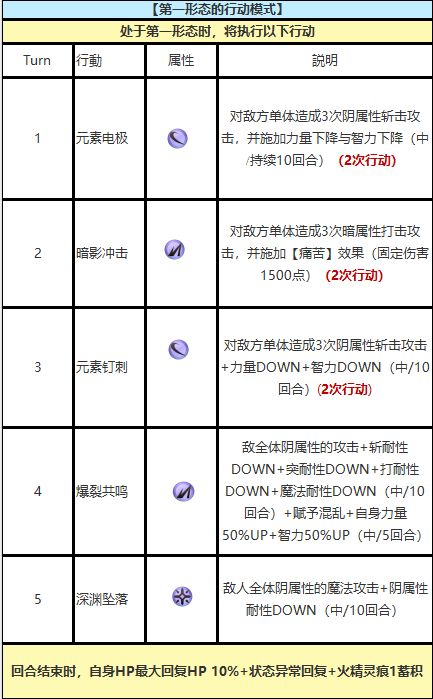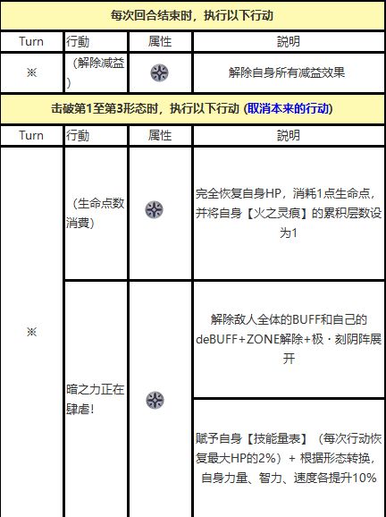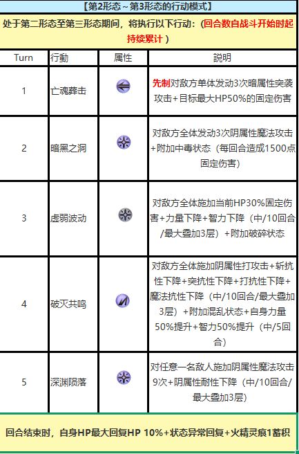 2.HP低于50%时触发的光环效果,会导致攻击、智力、速度下降50%,同时物理、魔法和全属性抗性各降50%,相当于受到的伤害翻倍。此外,攻击角色一旦触发这个效果就难以挽回,必须保持HP在50%以上。特别麻烦的是第二形态后第一回合发动的“亡魂葬击”,会造成最大HP50%的固定伤害,容易强制触发光环效果,建议对敌的时候带些受击回复和回血的角色。