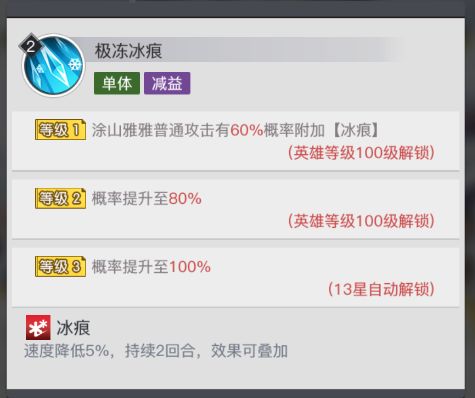 涂山雅雅技能机制全面,开局即可对敌方全体造成伤害并有概率施加【冰痕】,且怒气技也是对敌方全体生效,并有概率施加【极冰之锢】效果,使敌方全体进行减速或眩晕,能够赢得先手权,前期敌方血量普遍不高时可作为主C,后期更加偏向于提供群体控制与减益效果。