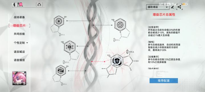 芯片选择双cd保证自身技能释放频率,应答装甲提高自身的抗伤能力,击破兼并可以让自己在团战中更好的存活,最后的芯片选择稳态构像提升自己一技能的护盾量和被动的回复量