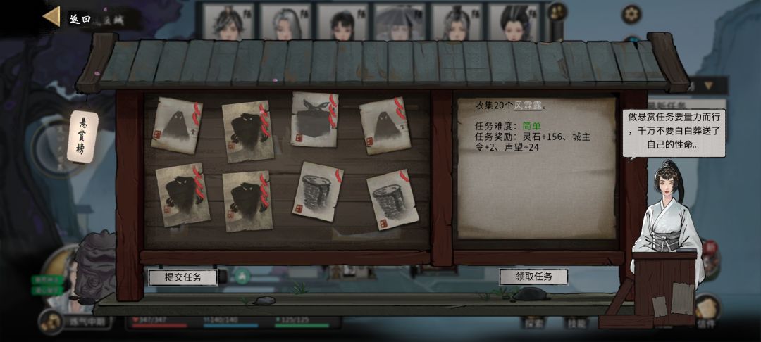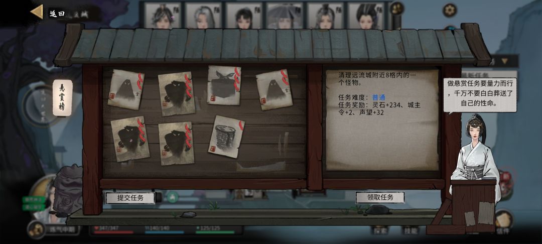 11.有了修为在身,接下来就可以去猎杀妖兽了。传送到任意城镇,到悬赏榜接任务(前期推荐收集材料和8格内怪物清理)。顺便在接一个夺回戒指任务,后续有用。