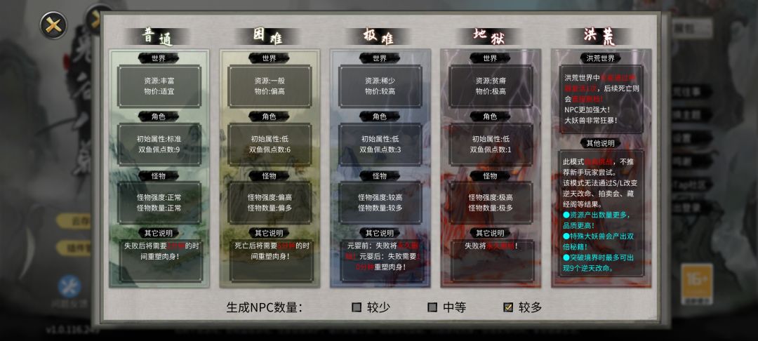 1.开局选择难度(新道友可选普通,重生道友可选洪荒)