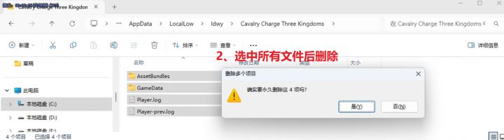 %USERPROFILE%\AppData\LocalLow\ldwy\Cavalry Charge Three Kingdoms 这个路径下所有文件删除