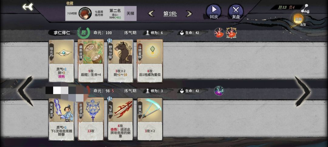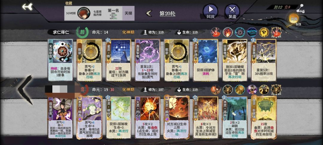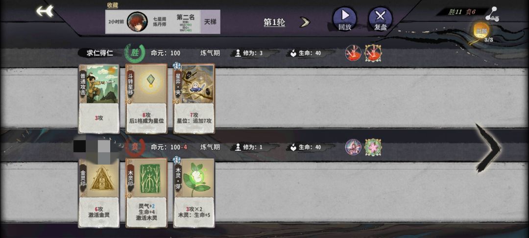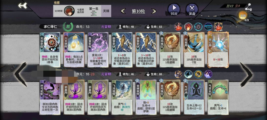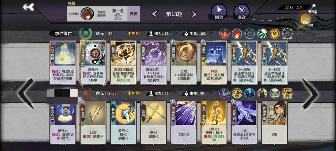 11轮到达化神期,此时就是看自身对于游戏内各种阵容玩法的理解了,各种对位博弈,例如二动护体丹,三动二动断,亦或者对付一些慢速卡组算好伤害速杀。具体一些简单公式可以去看早期大佬发过的攻略。