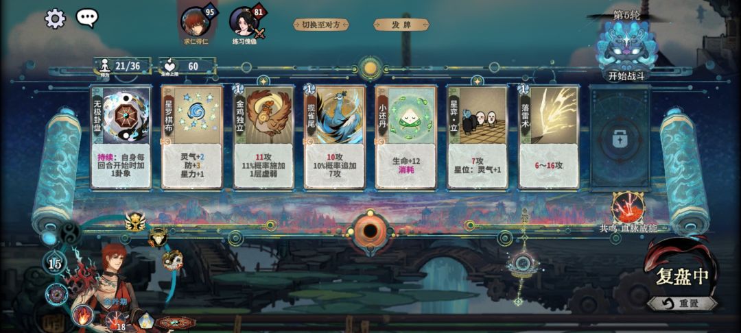第八轮直接上元婴,如果你选的盘子共鸣又d出来了星轨推演,飞,蜻蜓点水,虎或打,众星拱月,再加上一张消耗牌是有一定战力帮你过渡元婴到化神期间轮次的,具体摆位为:盘子,推演,飞,众星,飞/蜻蜓,虎/打,最后两张任意。(打过好几把元婴这样的牌组,战绩由于是手机打的找不到战绩了)化神之后能摆出:盘子,天元,乾卦,推演,飞,虎,飞,断。成长很恐怖,但是扛不住速杀,出伤慢。不过这也是下下策,是没有六爻和轰雷的摆法。建议来了卦雷组件直接转型卦雷,两套需快速做出取舍,不然手上会卡很多牌。