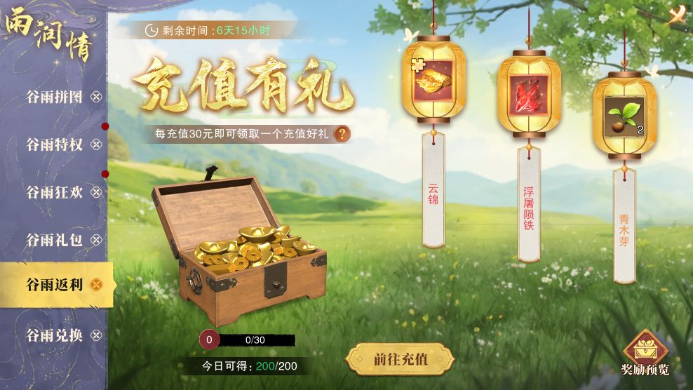 活动内容:活动期间,每充值满30元,即可开启1次谷雨返利宝箱。有概率开出云锦、浮屠陨铁、青木芽等。