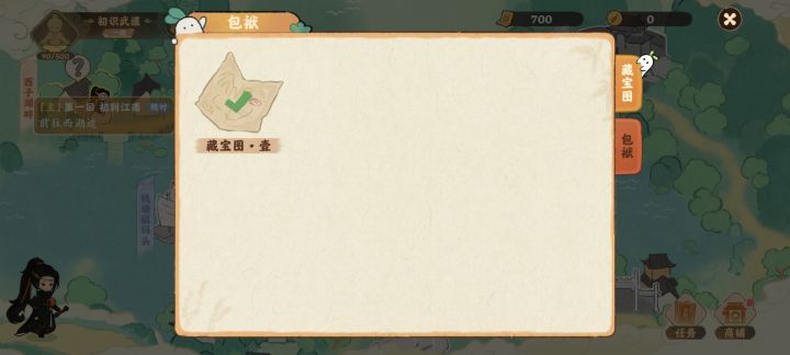 主线西子湖畔第一个小分支路线有藏宝图一,包袱里点击使用直接前往野外树林探索,全部点位探索完之前可以重复走,点亮全部卡牌之后入口会消失