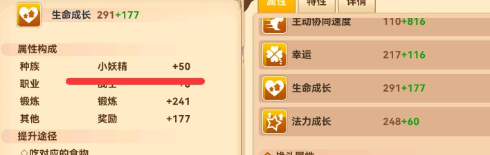 从台服大佬的统计我们可以知道,小妖精是成长全耐性,但是成长值多少?不知道。根据其他种族的单成长特性对比,预估小妖精的成长抗性是1左右或者更低。为了印证判断,找来了2个战力差不多,等级差不多的,不同种族的2个角色排名面板对比图。为啥是排名面板,因为排名面板很多数据显示不全,例如秘宝。后天,蛋糕,装备。都不会显示在排名的数据内,排名只会显示先天和变异之类的属性。