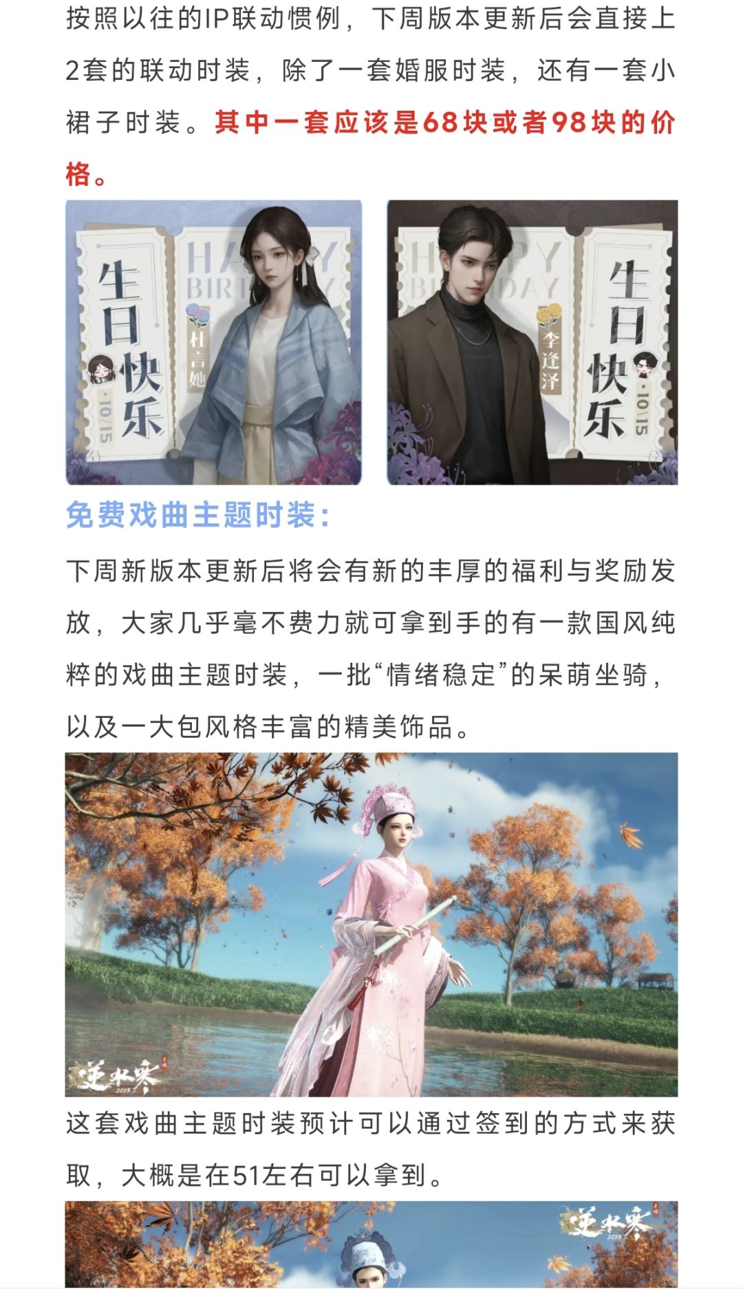 逆水寒手游签到送免费时装,下周68块联动时装,纸嫁衣联动,橙戒开放135级,新增博算命功能