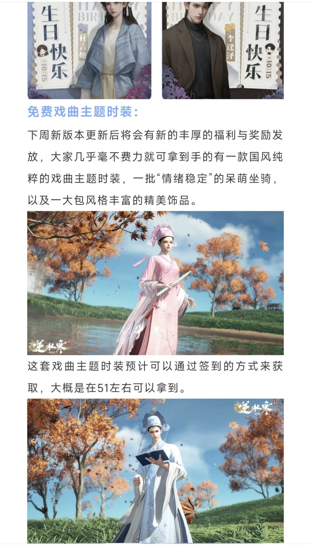 逆水寒签到送免费时装,下周68块联动时装