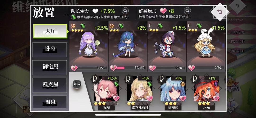 一些小提示,家园放置里面,记得手动放角色,很容易忘记,可以加队长生命,伙伴生命,能力,金币加成等等,记得滑下来还有一个,伙伴头上有摸头表情可以增加好感度