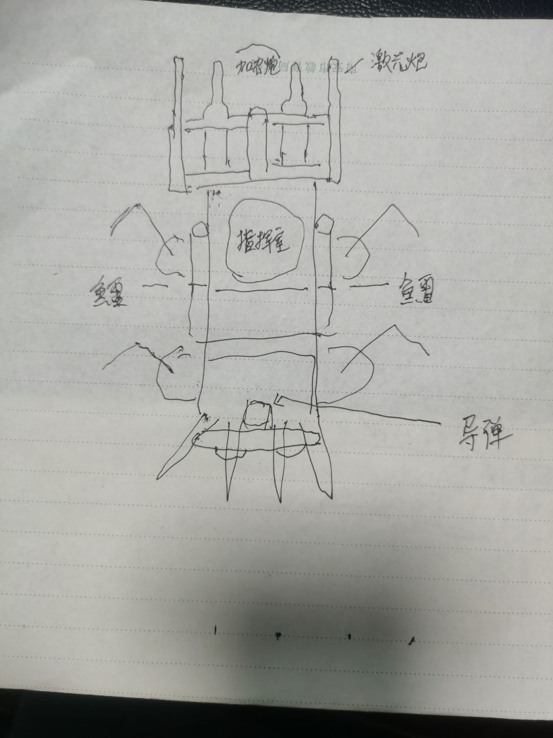 本船前方各有两门加农炮和激光炮,中间可以发射鱼雷,后方有一个导弹发射口,两端的四个触角负责分拣回收宇宙垃圾,中下的停机台可以释放和回收机甲