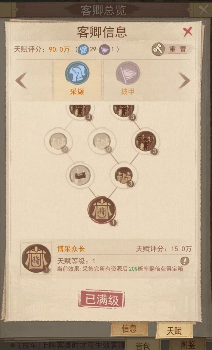 橙色客卿(多宝酱)升级到4星,再把采集天赋学出来,将有20%的概率翻倍获得宝箱。安顿在四车,四车采集最短时间的矿。采完再去收别的车的残田。这样每天都有机会出翻倍。