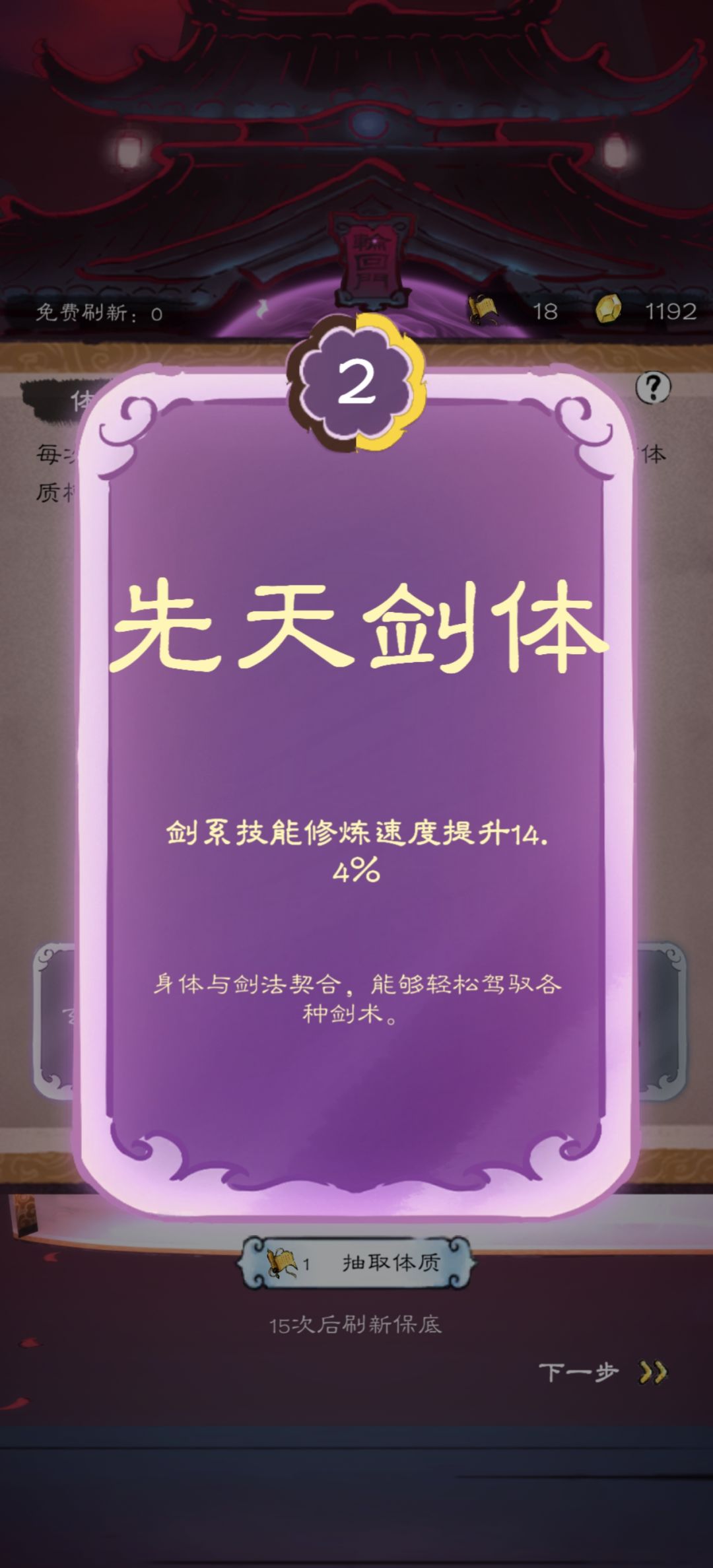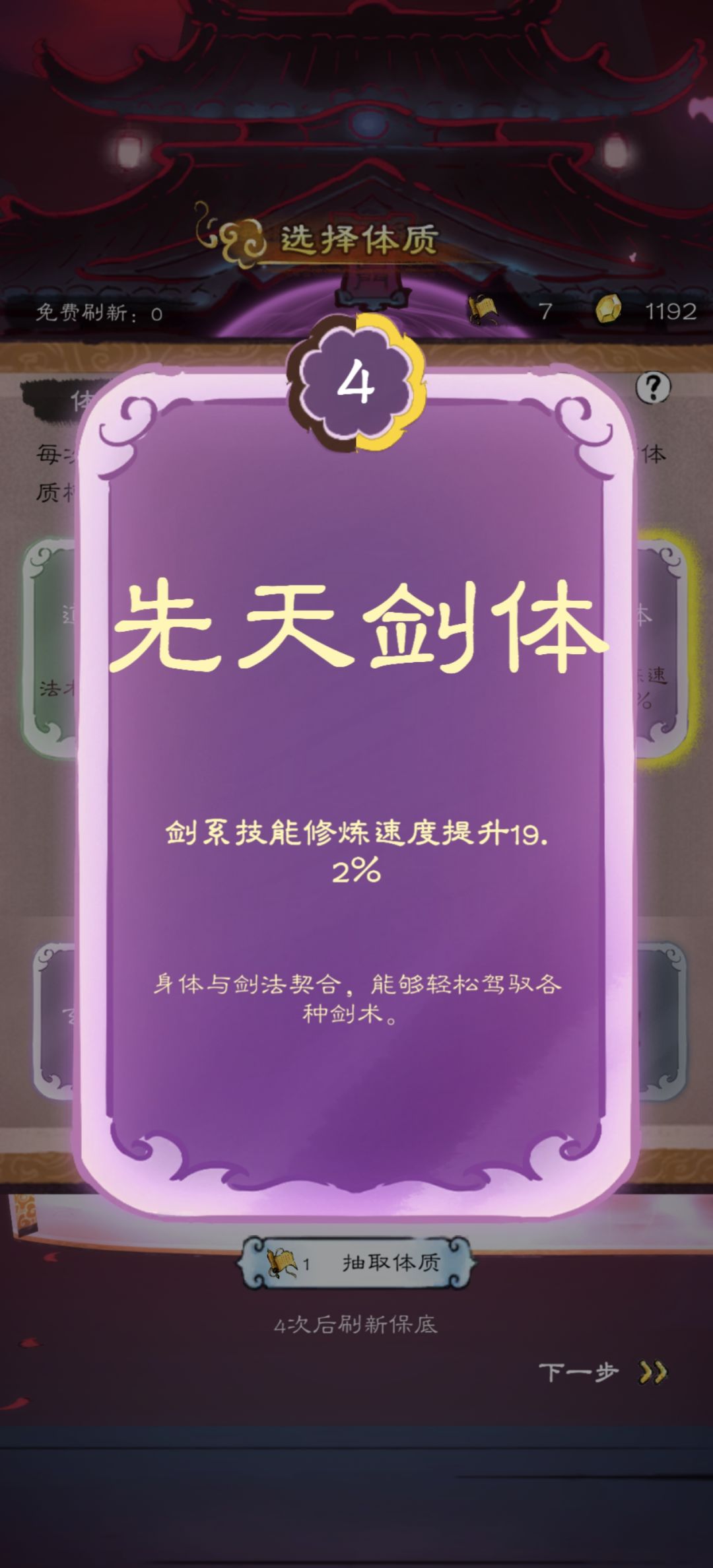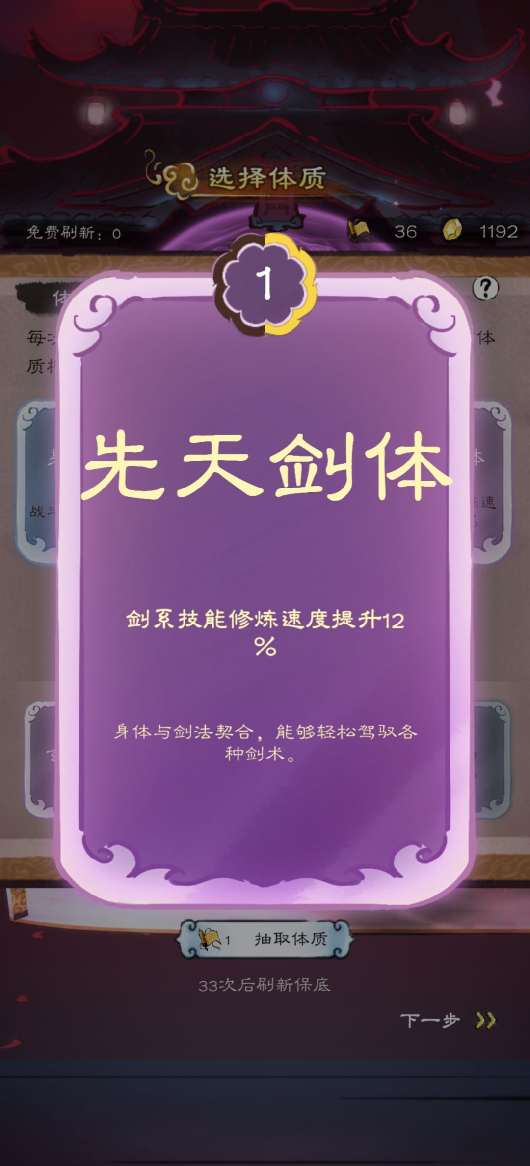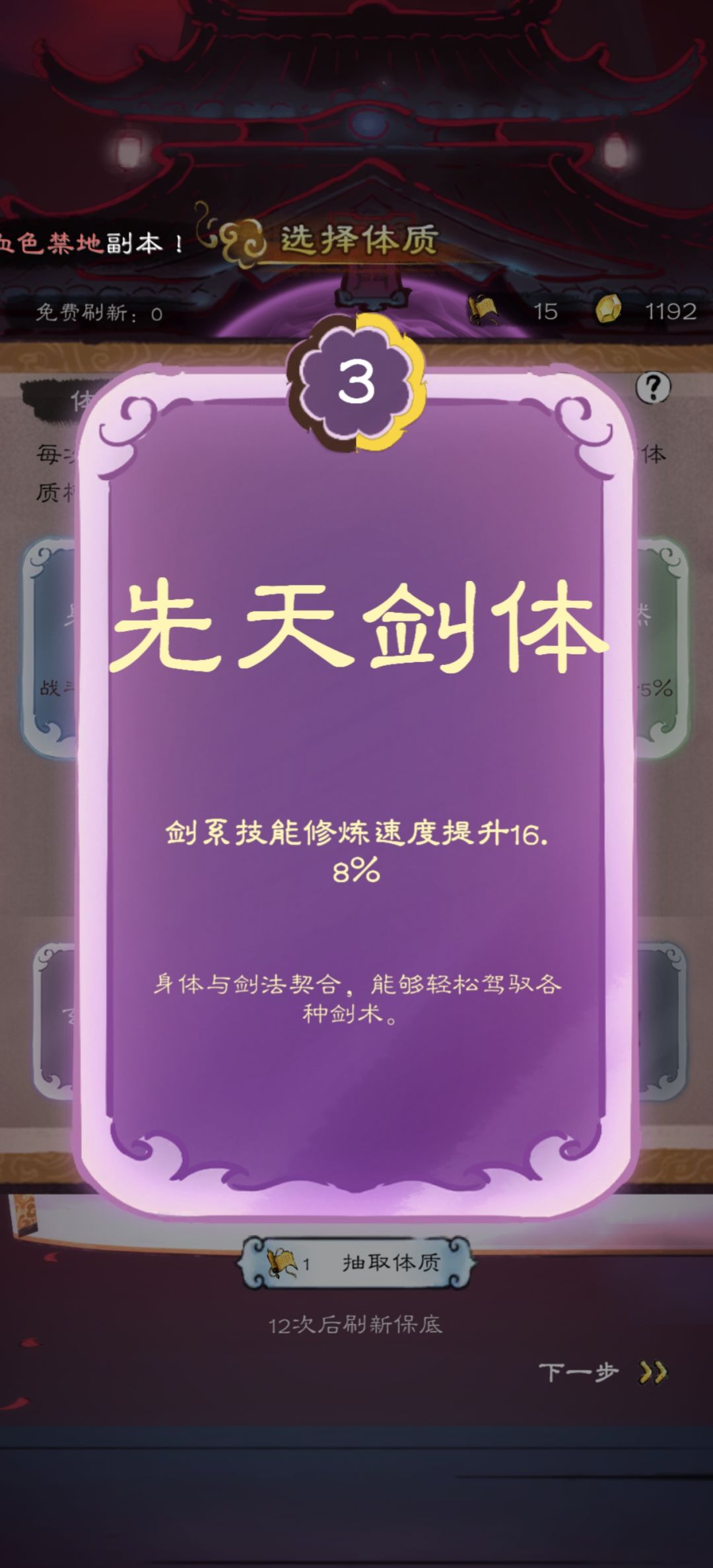 先天剑体抽到顶级啦,增加剑法修炼速度24%,看起来十分超模,但是目前应该是只做了剧情,体质的功能没有效果,所以对修炼速度并没有什么鸟用