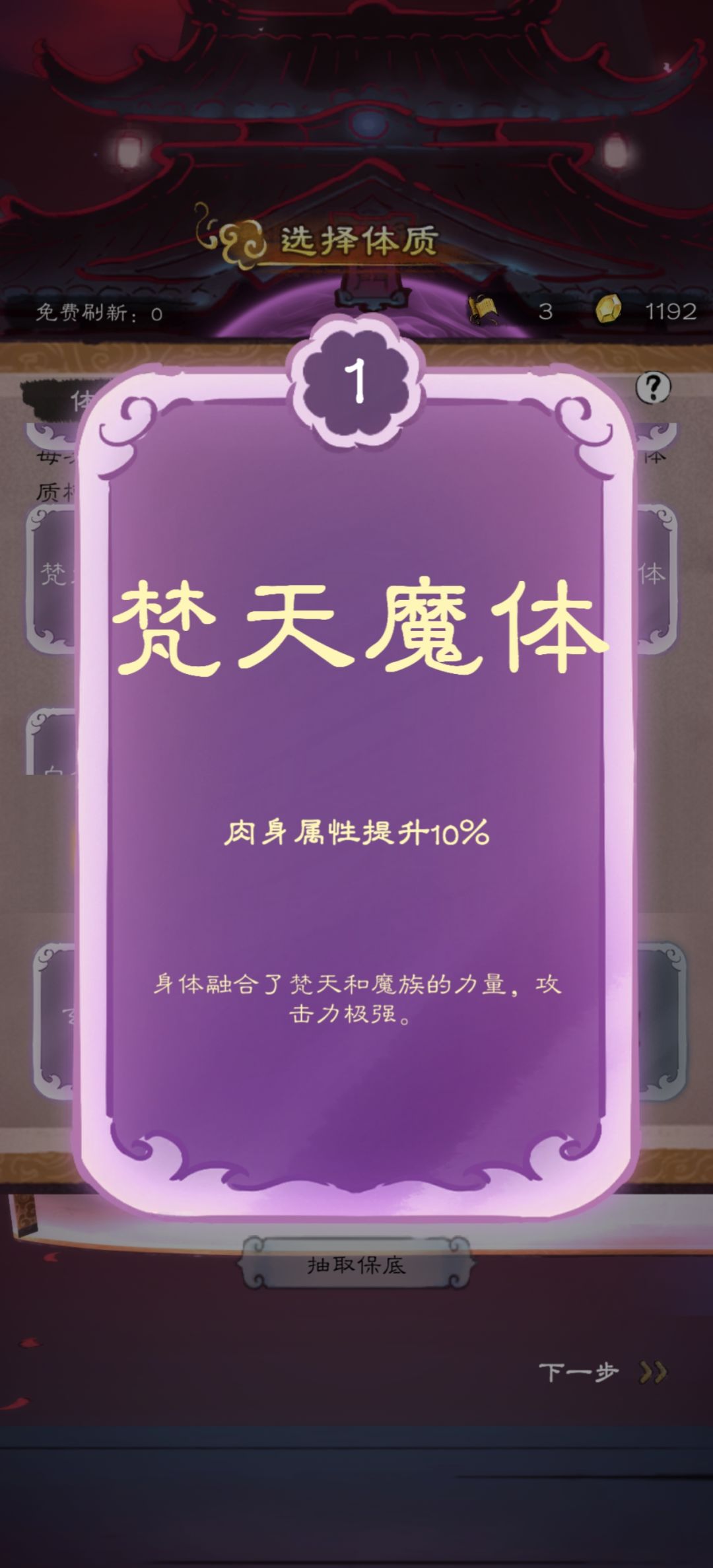 最后有个梵天魔体看起来也不错,也是可以成长的,我没有选,不知道抽到顶级是什么,有选了的可以发一下看看