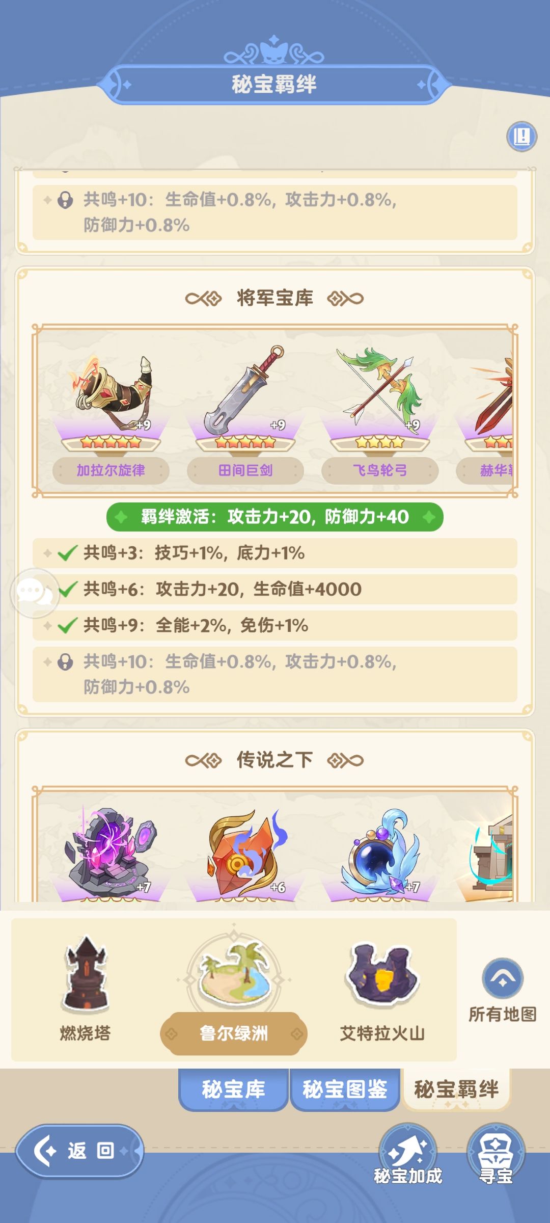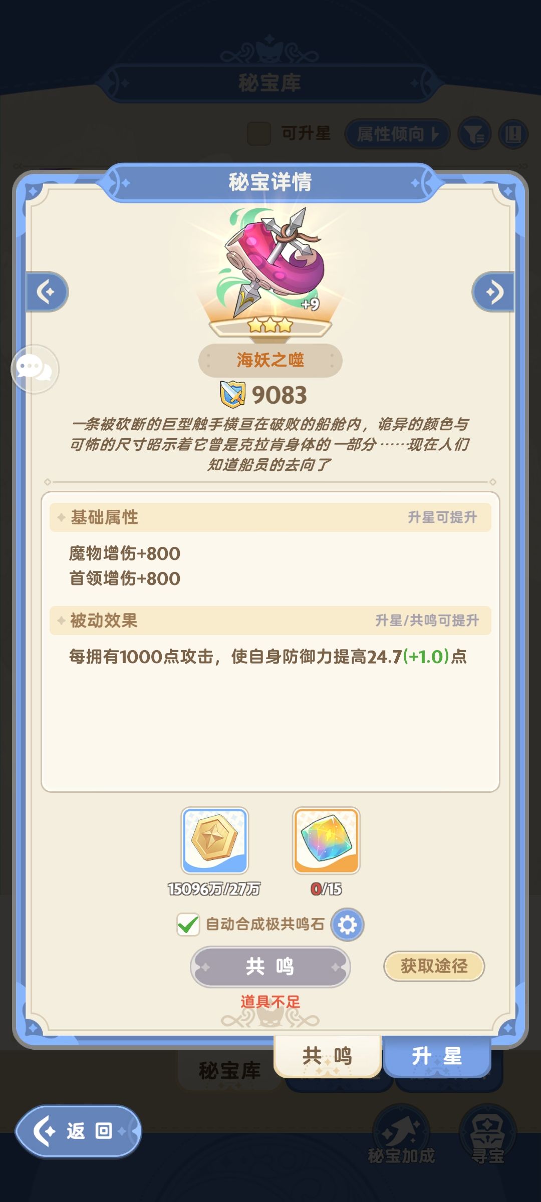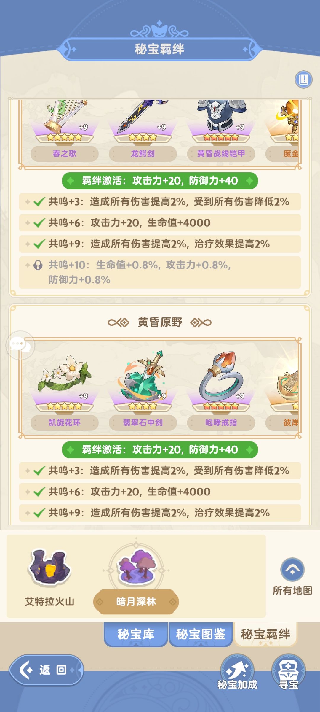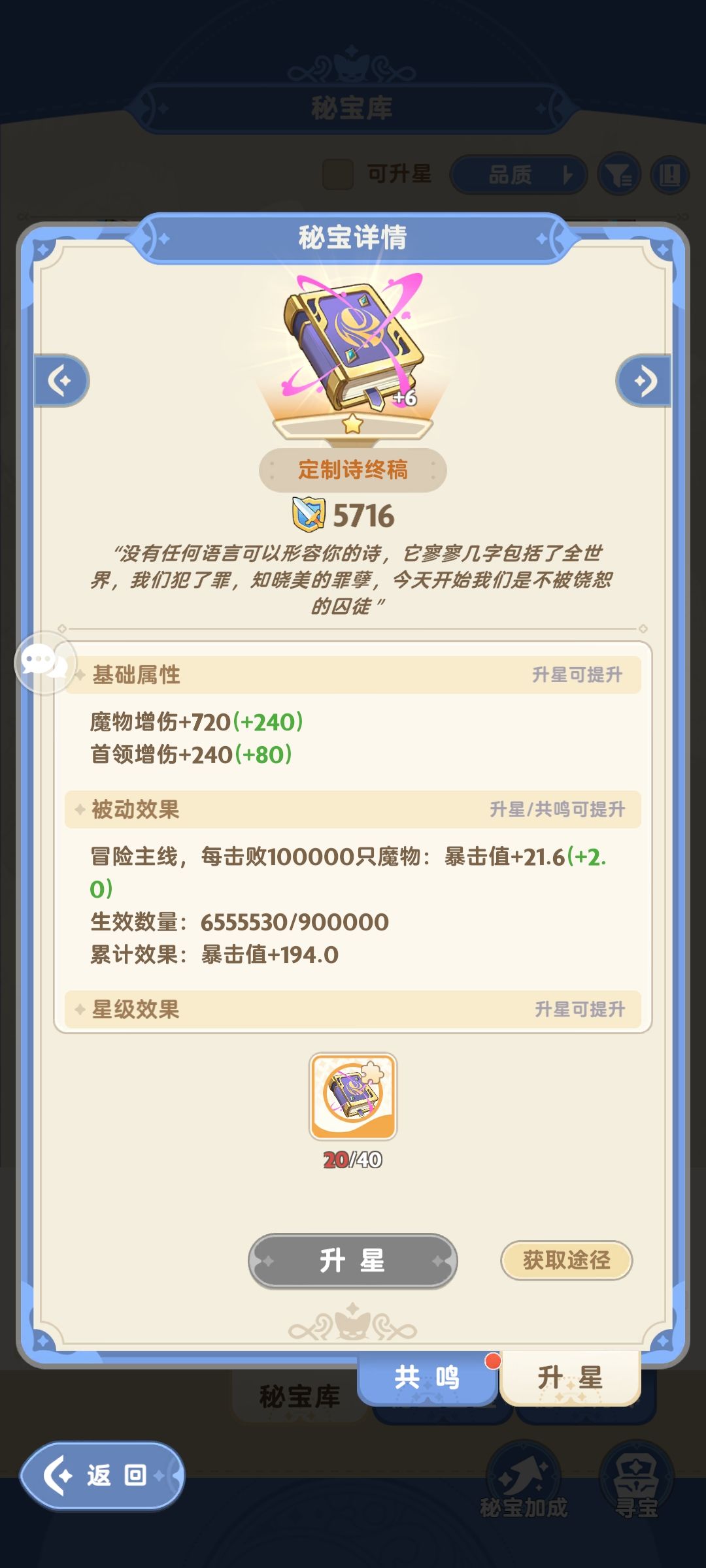 资源类获取翻倍秘宝(如捕风袋)和百分比伤害提升秘宝(如赞美诗)可以单独优先共鸣+9,以保证获取到最大收益。