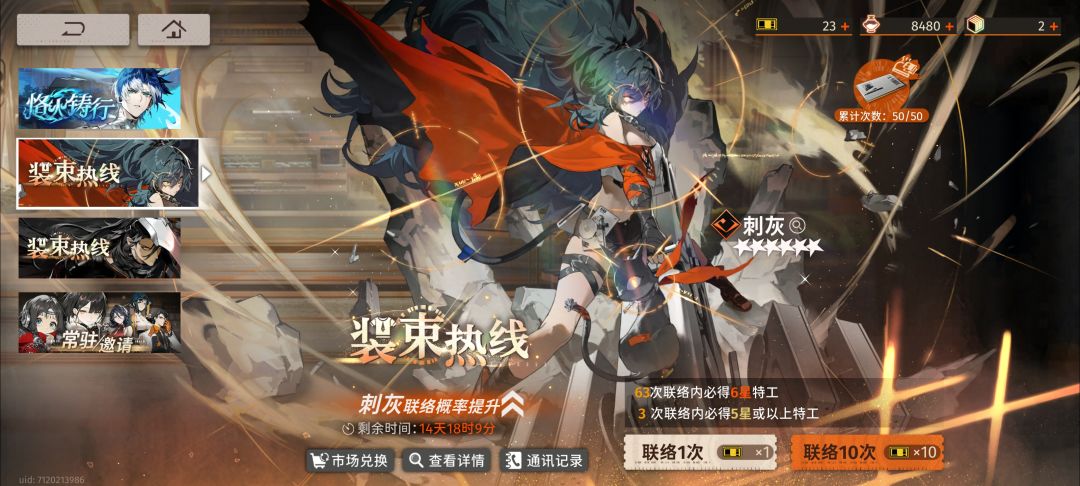 我是一路推到了第四章,领各种任务奖励后下的池子(可以给队伍补一个输出),我原本回坑的时候有60多张票,相尘只有1000多,我不太了解强度,随便抽的刺灰,刚好是50抽出的,暴率比较正常