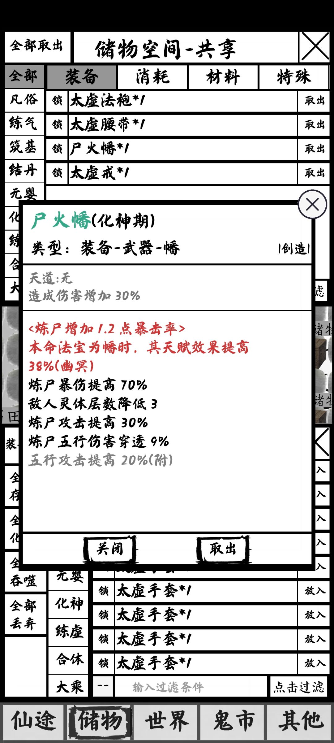化神期的内视可以洗练出两个法宝幡加成的可以在化神期做出自己想要的装备,前期装备过渡即可,由于前期是炼体的所以基本过图没有任何问题,纯法修过图会很难受
