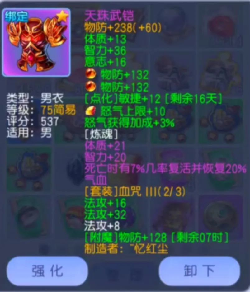 炼魂:炼魂智力22、意志17,属性出色,法师毕业级别。特效为愤怒降低7%,对法师职业已足够实用。