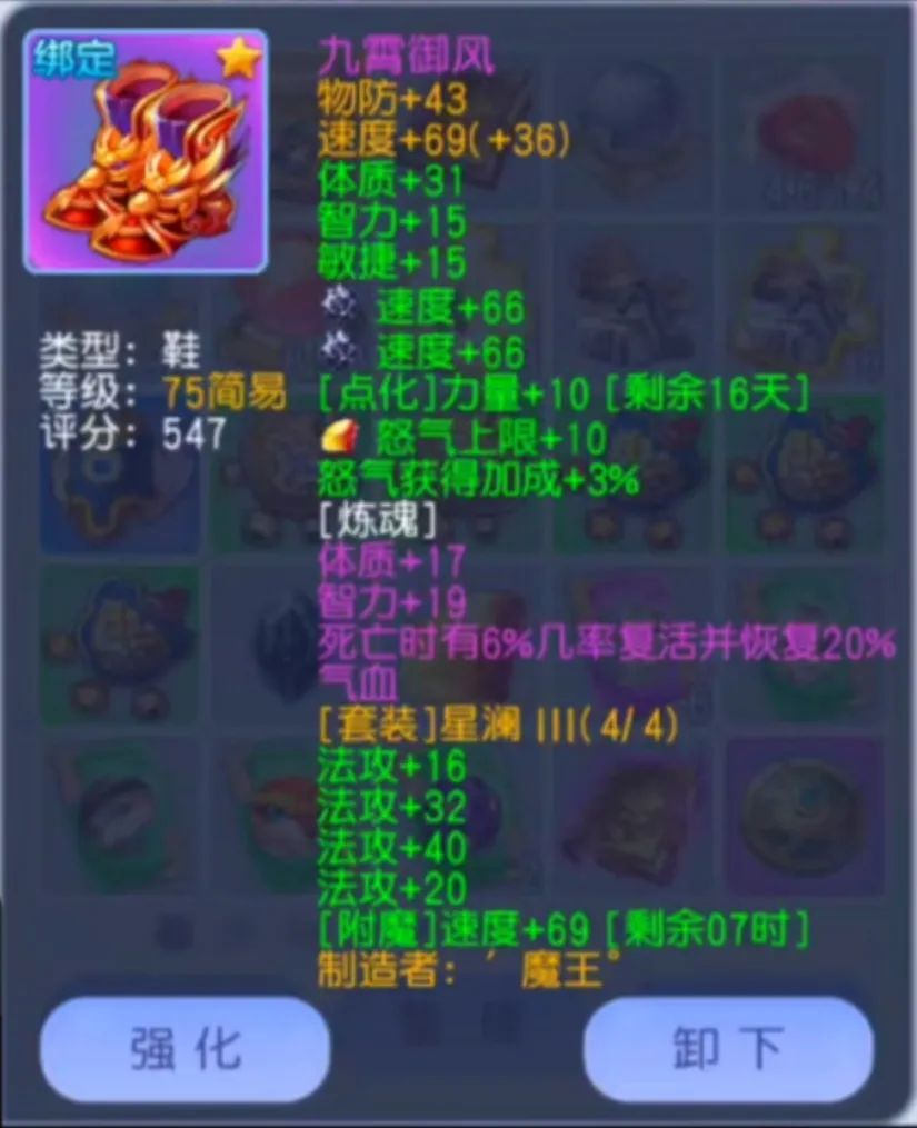 炼魂: 炼魂属性智力19、体质14,提升空间较大。特效为6%神佑,未达最高7%,建议洗炼优化。