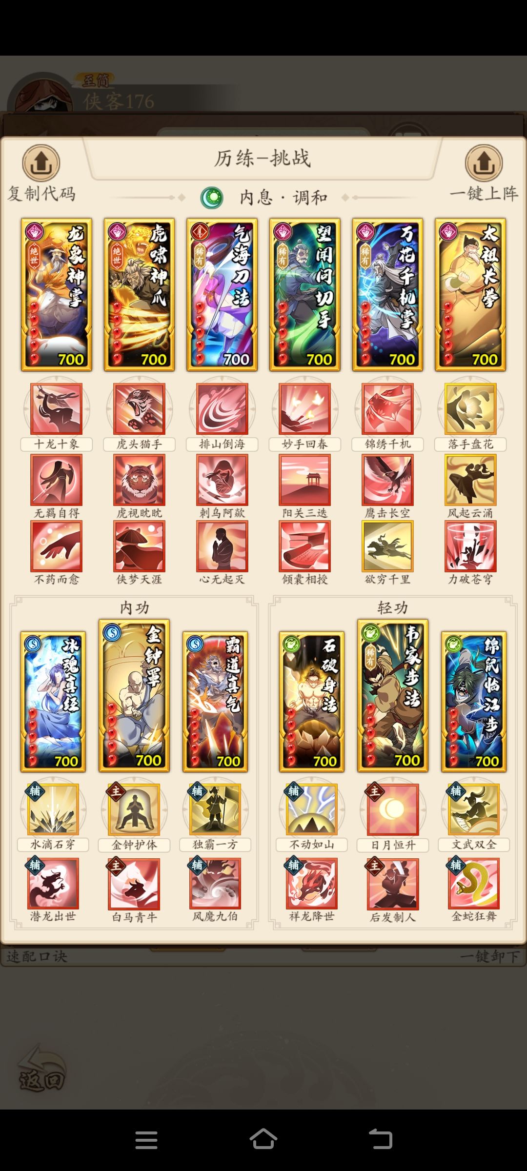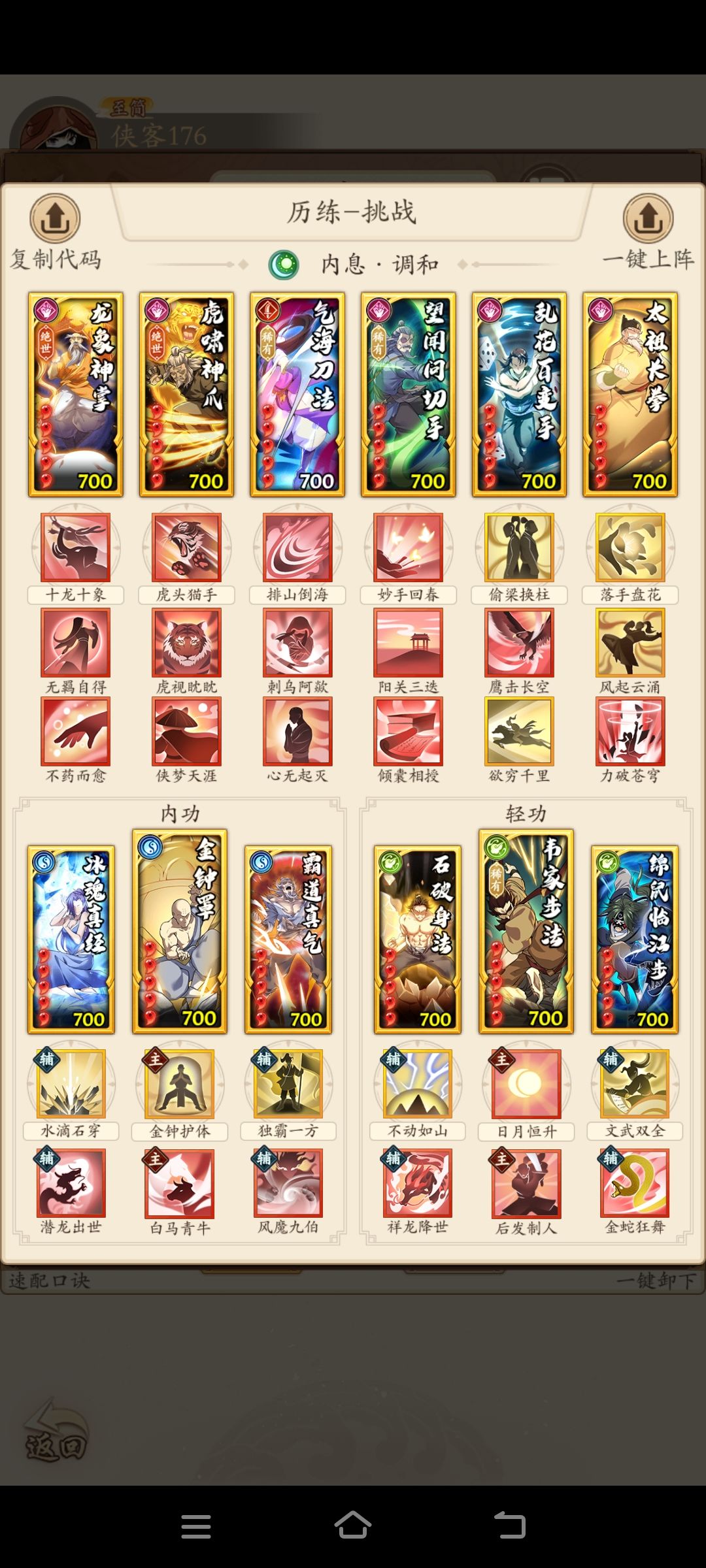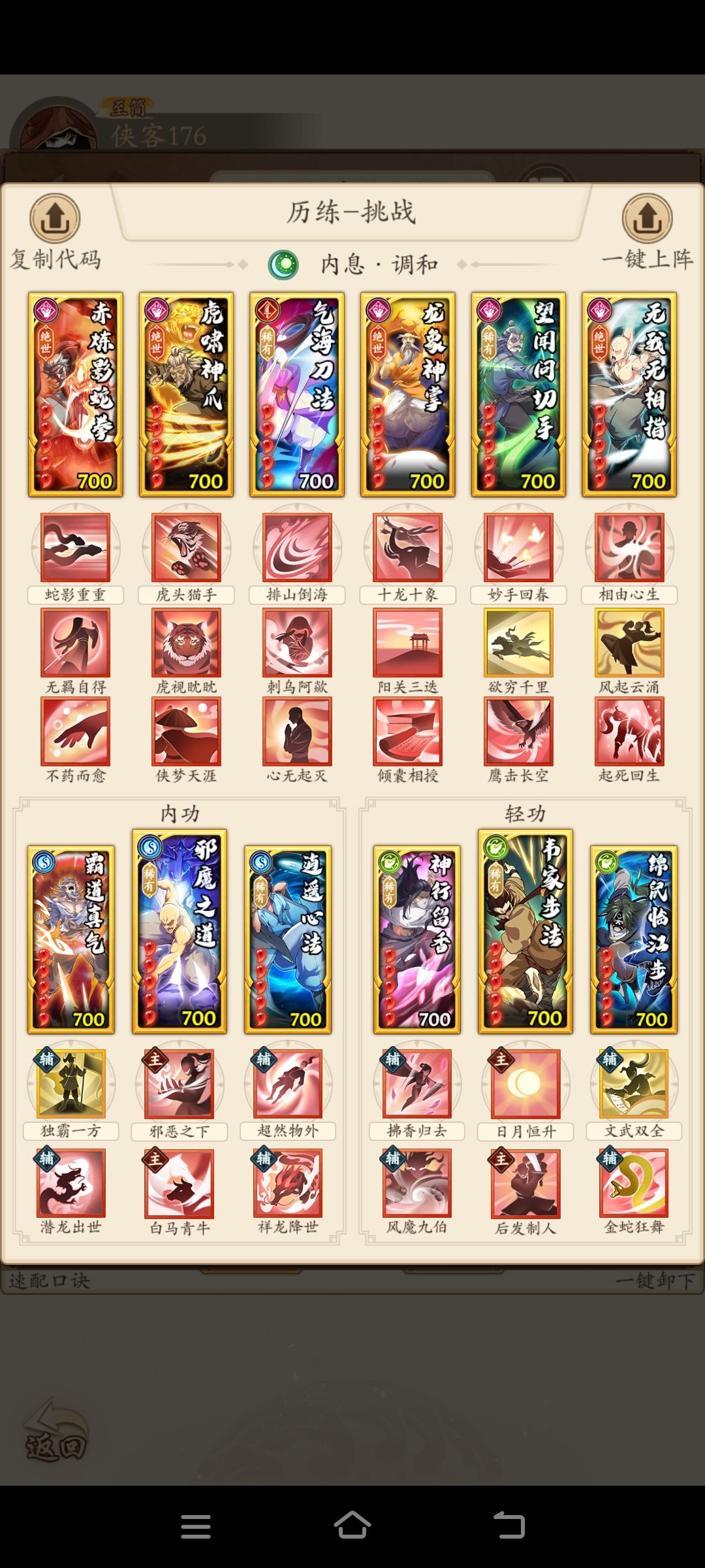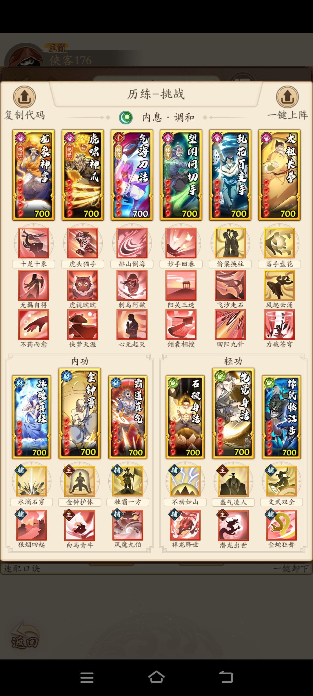 这次武学调整龙象加了被动恐惧,太祖变二级心惊,无相加了30招式反弹,聚气全部削弱,所以下面都没有上聚气招式,那么调和拳辅运招式就更多,这些对调和拳来说肯定是加强,那么加强后调和拳就得围绕龙象搭配了,上五个拳武学,下面是一些搭配。
