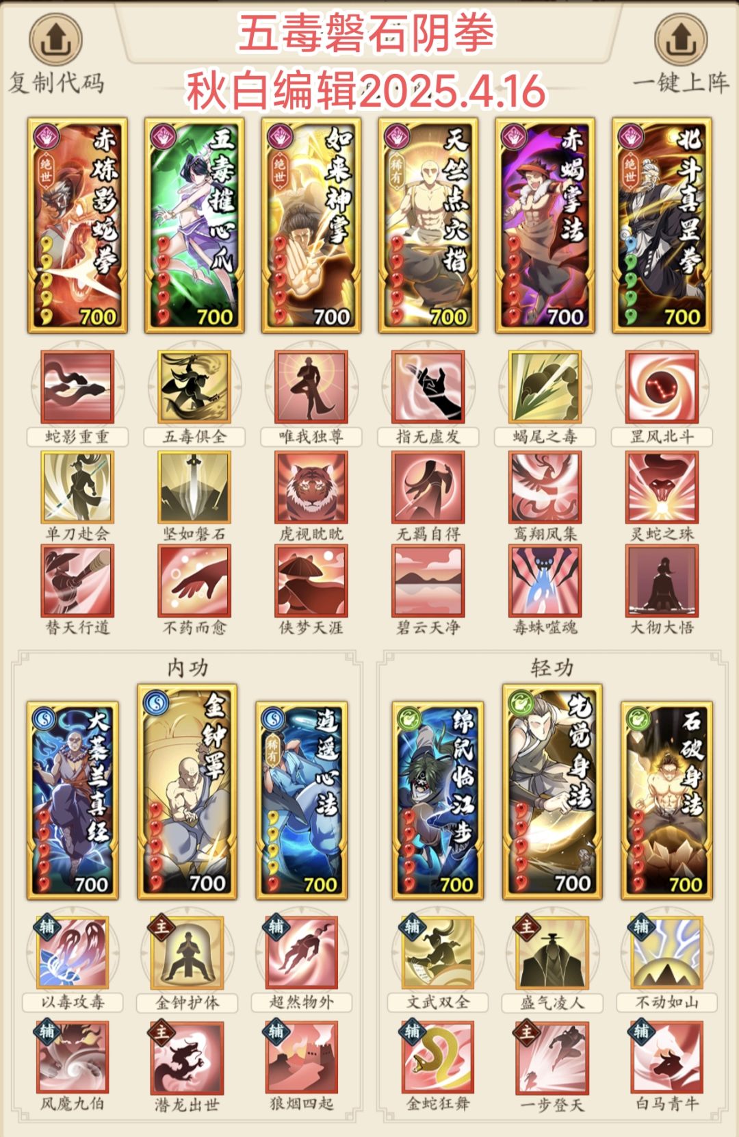 因目前版本畸形,超模后手招式过多,故此选择前置几个武学都不带出手,只靠赤蝎北斗来打输出,当然 也不用担心敌方全精进无法触发你携带的后手招式,因为有白马青牛招式在,我方可强制触发后手,而且是在北斗回合强制触发,会获得高额招式伤害+爆伤暴击加成.