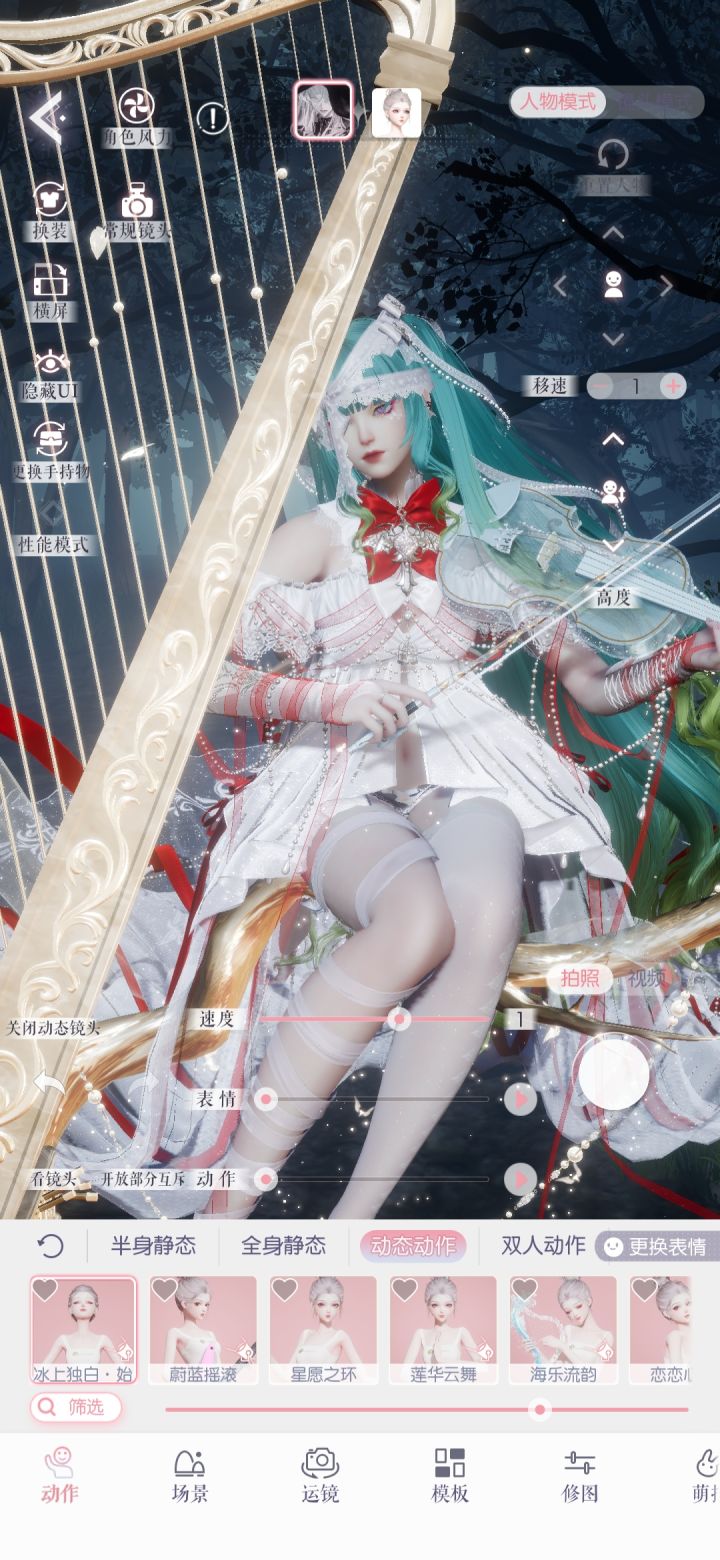 2.人模1携带竖琴背饰并使用一周年赠送的免费动态动作“冰上独白·始”,把速度调到最慢,让人模1跑出镜头。❗️注意点❗️人模离得太远会导致背饰丢失❗️