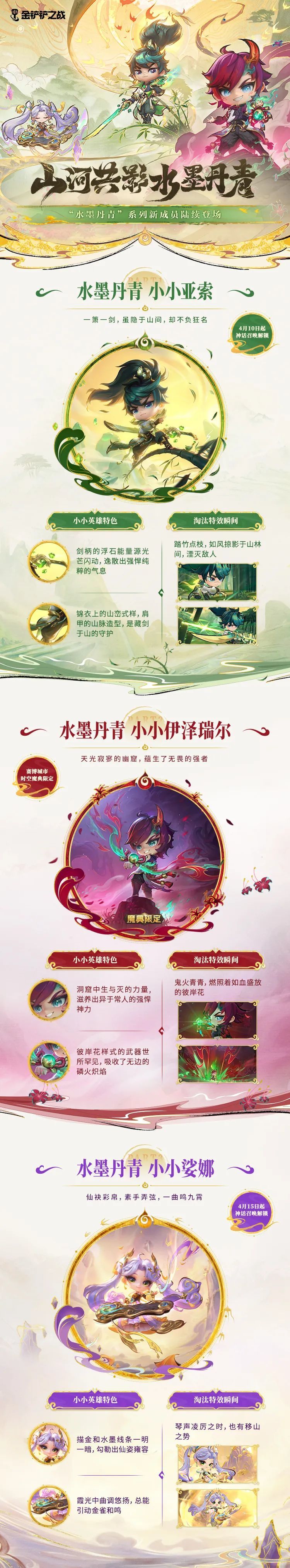 4月15日,【水墨丹青 小小娑娜】将在神话召唤【琴漾墨漪】中上线!前往金铲铲之战,共品水墨丹青之美!