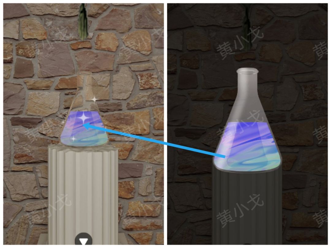 20.点击白色柱子上的玻璃瓶,根据【文件】上的线索,按顺序倒入药水