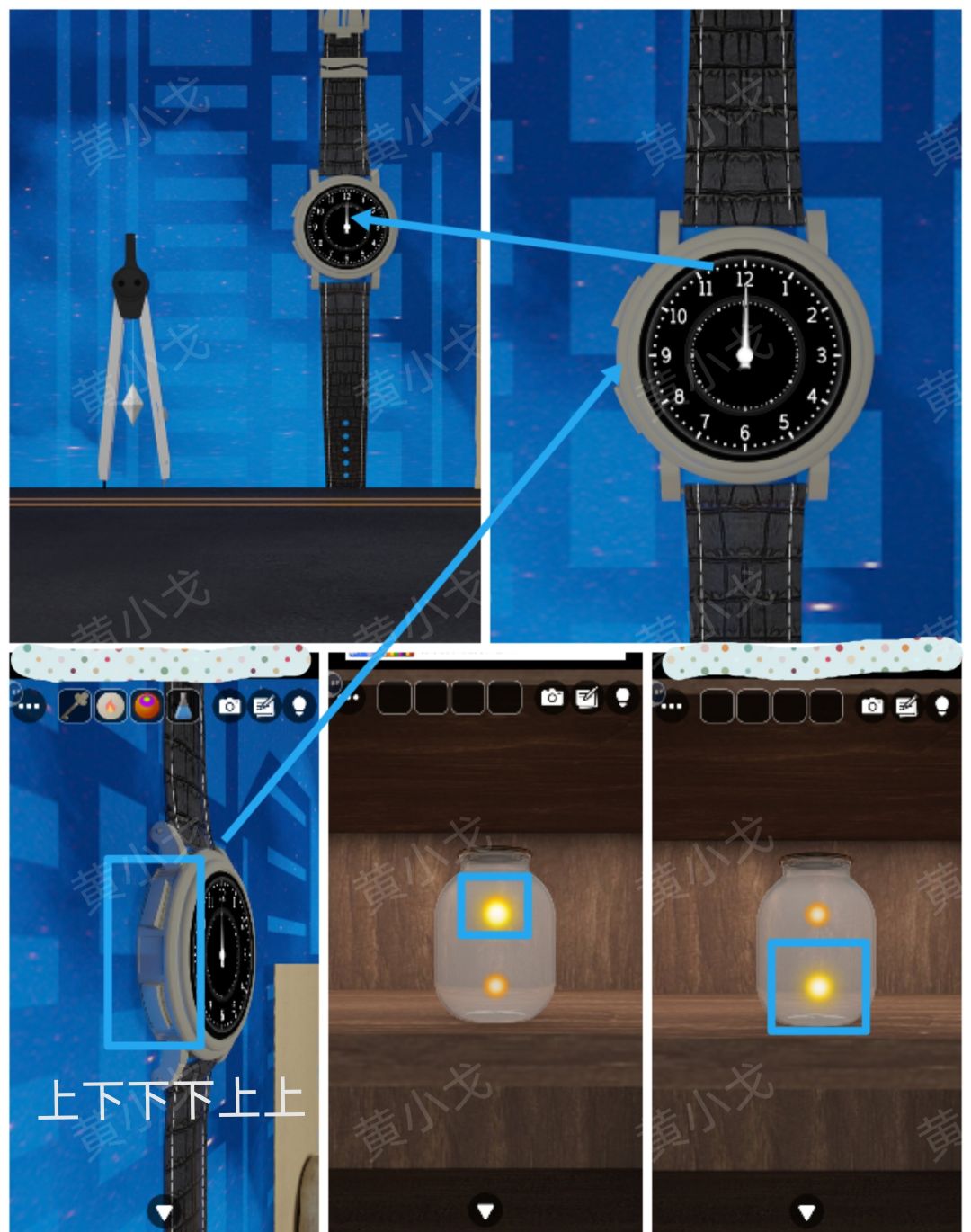 7.点击手表侧面的按钮,根据[书柜]场景玻璃瓶里的线索,按顺序按下按钮