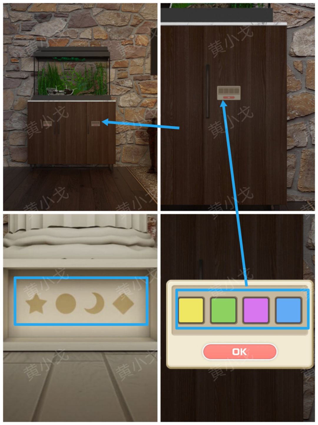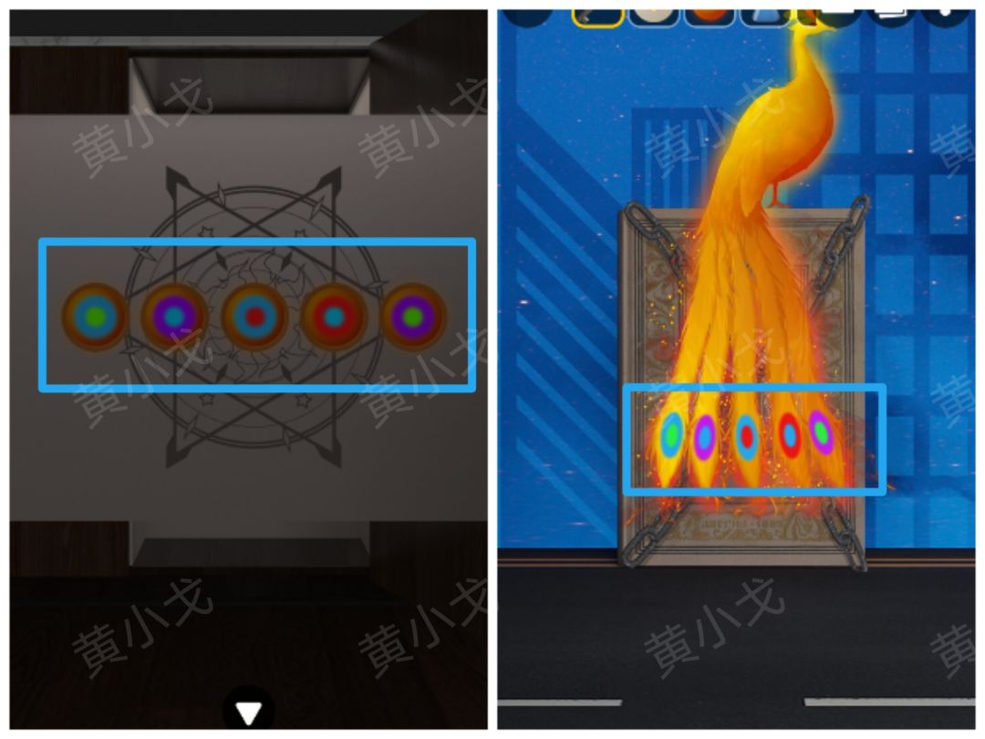 16.点击柜子右侧柜门上的密码锁,根据[书柜]白色柱子暗格里的图案顺序,结合四个场景台灯灯光颜色和图案线索,调整密码锁