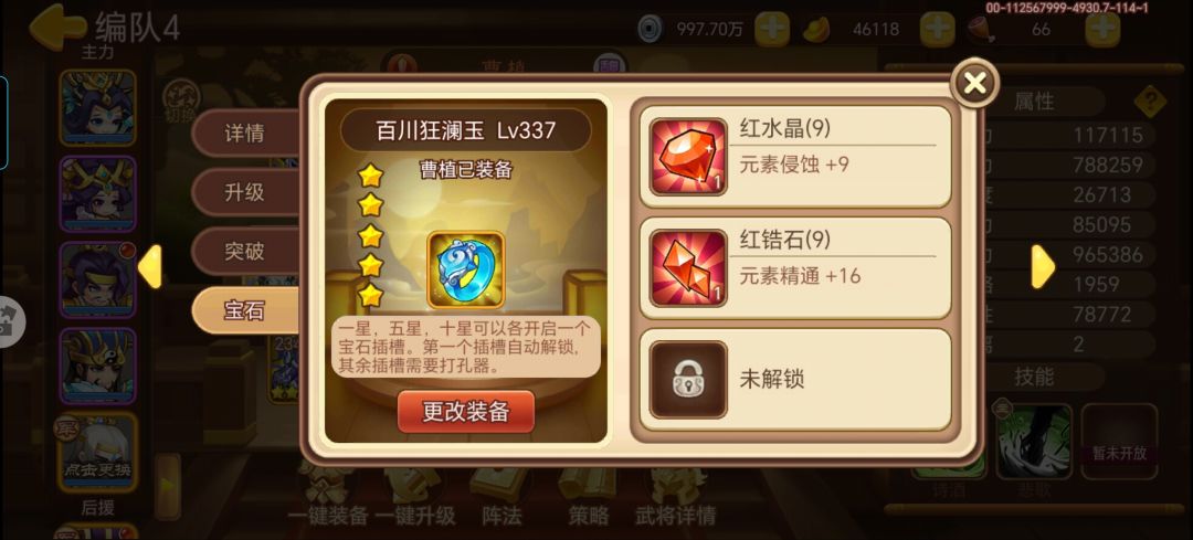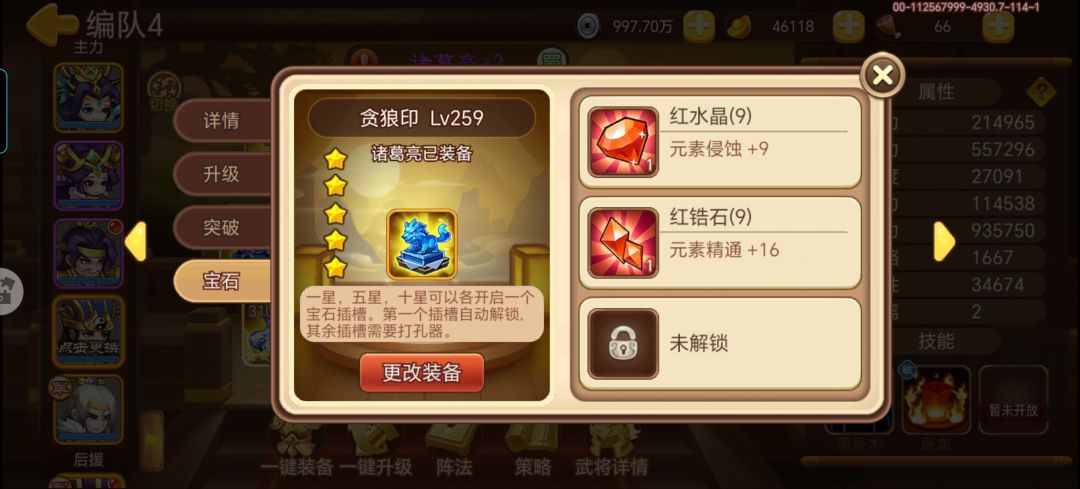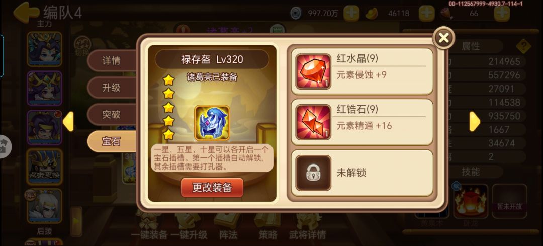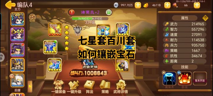 文曲剑可以先突破十星 其他部位可以先突破五星 宝石300级以前 请用五个七级智力宝石过渡 不推荐八级宝石 一来新人难以获得八级宝石 或者说需要时间 二来五个七级智力宝石的孔明和加二乐进,乐进需要风神盔打一个六级速度宝石 这个风神盔 打女巫支线给许褚用保证许褚比孔明先手 裸衣丢连弩控 让孔明大水输出获取剑魂套 打赢130精英塔就可以获取每日重要的元神碎片和觉醒精髓 慢一天就少一天材料 得不偿失 而且孔明带七星 主要是靠连击输出