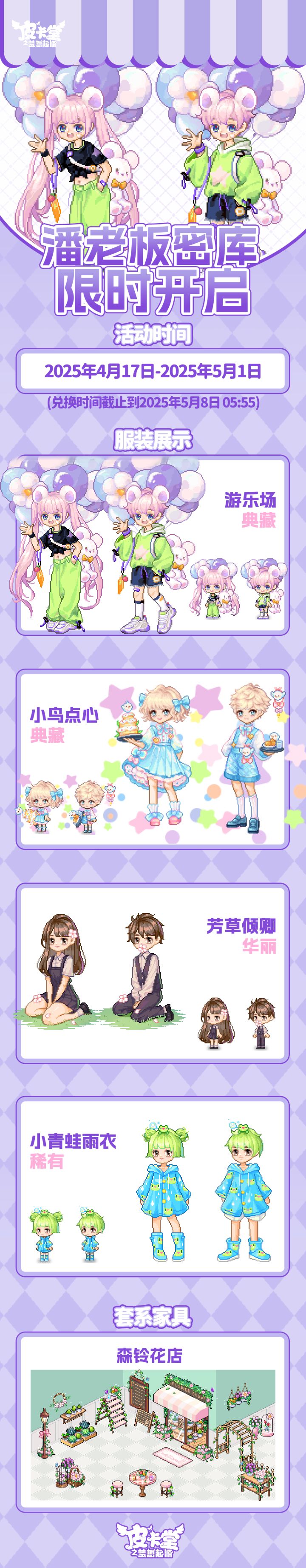 -【潘老板密库】返场!参与活动可获得典藏套装「游乐场」、典藏套装「小鸟点心」、华丽套装「芳草倾卿」、稀有套装「小青蛙雨衣」以及「森铃花店」套系家具!