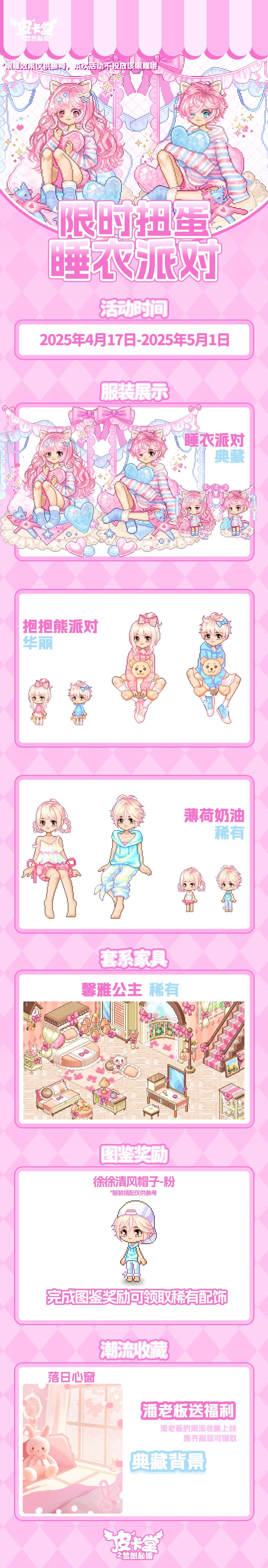 -【限时金币扭蛋】更新!参与可获得典藏套装「睡衣派对」、华丽套装「抱抱熊派对」、稀有套装「薄荷奶油」,套系家具「馨雅公主」!收集服装可获得名片背景「落日心窗」!完成图鉴收集任务可获得配饰「徐徐清风帽子-粉」!