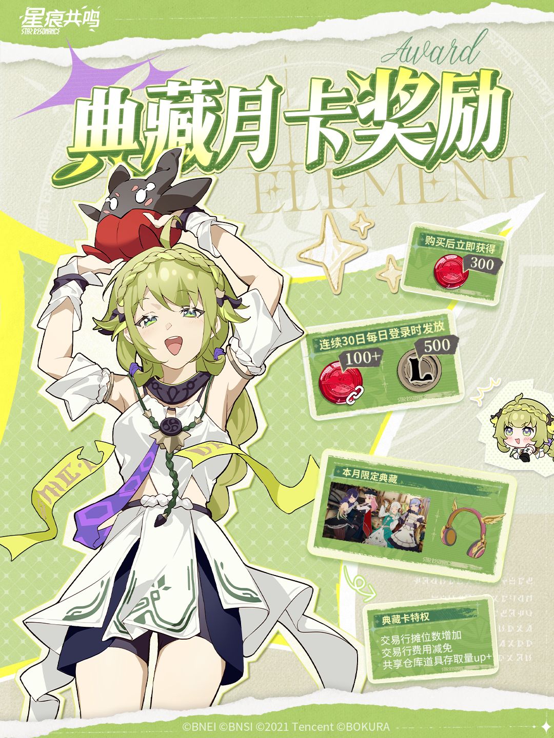 选购典藏月卡,可在未来30个自然日中获取每日奖励,还有月度限定的典藏卡面和可爱饰品送上~希望冒险者喜欢!