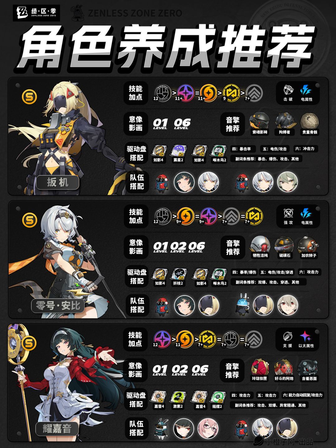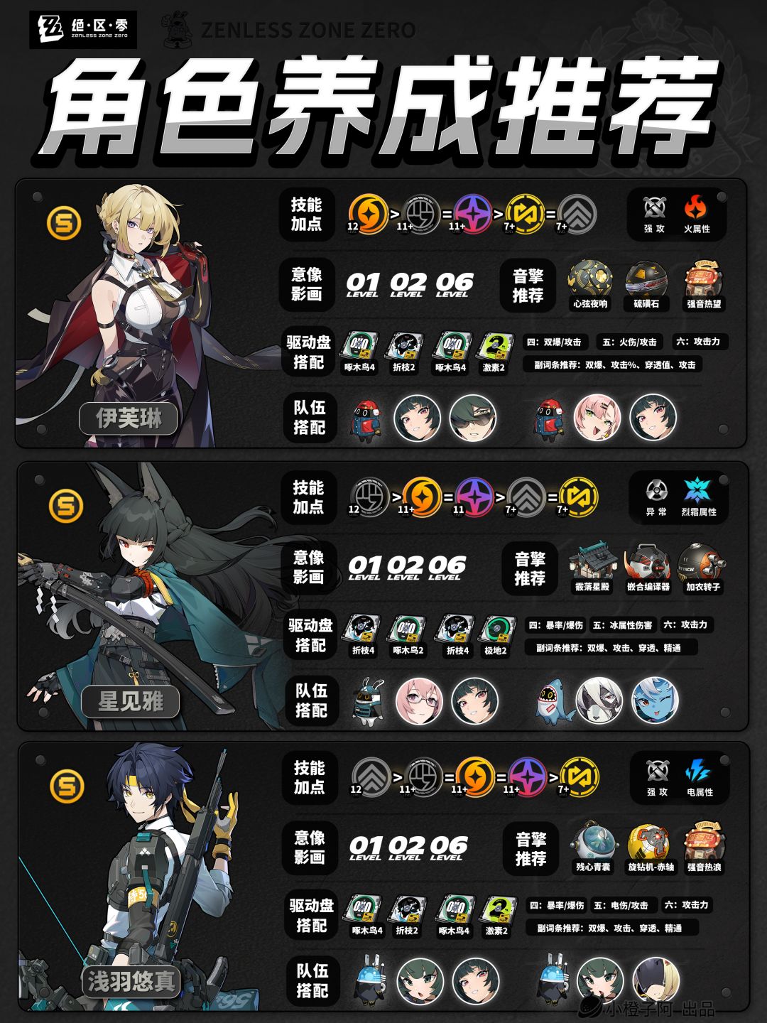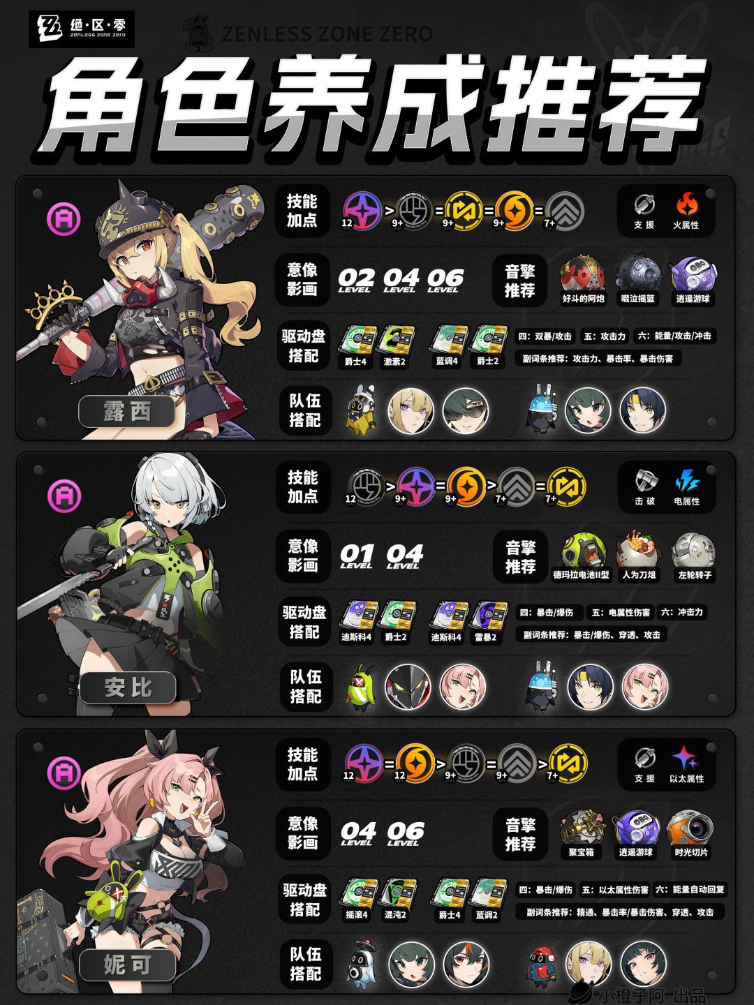 再就是一点,由于图片大小的限制,橙子每次是把角色配队更新到最新角色的组队情况,但并不代表角色只能有这两个配队,比如支援角色【丽娜】,丽娜可以加入绝区零大多数的队伍,而不仅限于下方展现的两种配队情况。