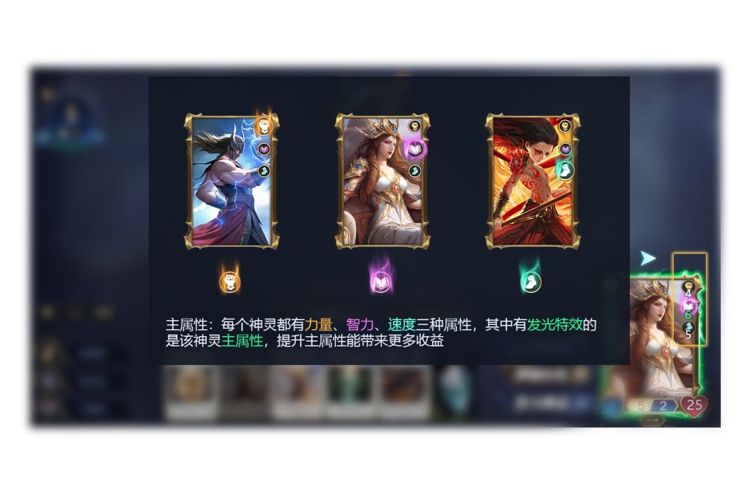 。在基础属性中,每位神灵拥有一个独特的主属性。 在游戏中,主属性会以醒目的发光特效显示, 方便玩家快速识别。