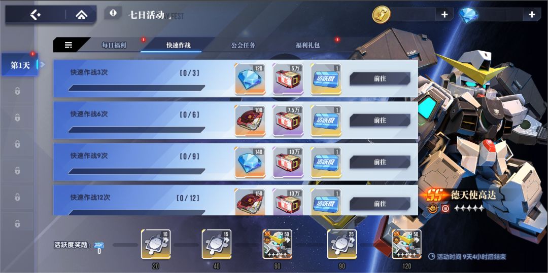 指挥官们可以通过完成七日任务获取大量机体养成奖励,完成指定个数的任务还可解锁包含SS重型机体【德天使高达】在内等丰厚奖励,完成所有任务最高可以获取2台【德天使高达】噢!
