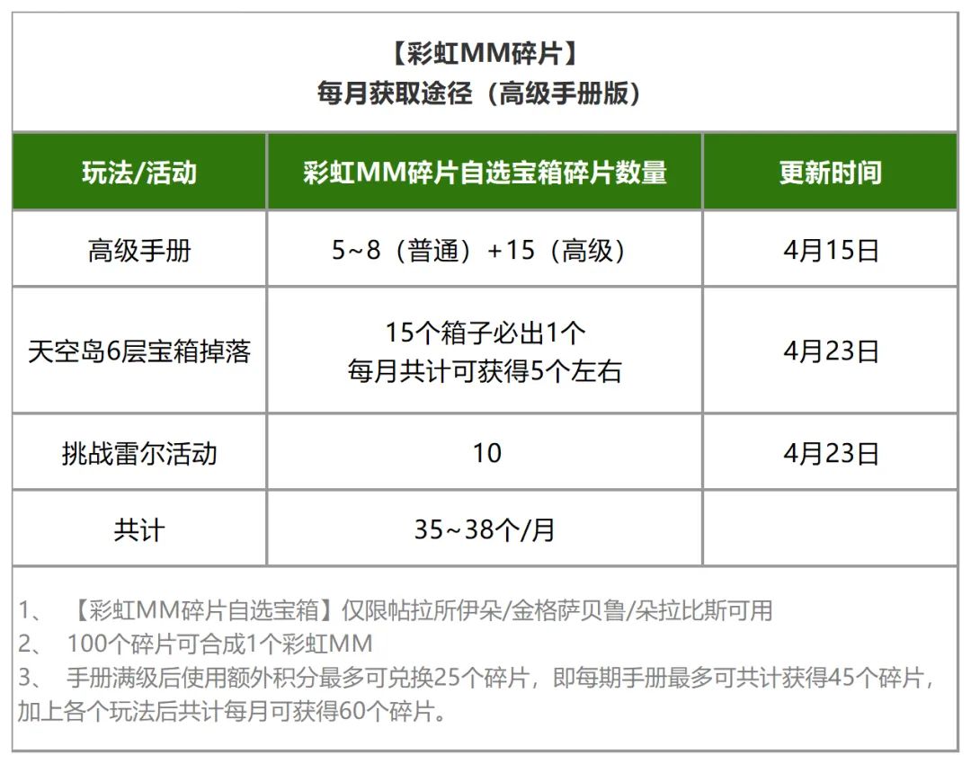 购买高级手册更能获得【彩虹MM碎片自选宝箱】碎片自选宝箱*15,并且满级后每个月可额外兑换最多25个碎片。总体来说,解锁高级后可通过手册任务获得20~23个碎片,加上满级后额外兑换的部分最多可以获得45个碎片。