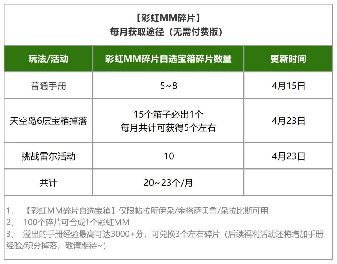 除了上述获取途径,后续更多琳琅满目的福利活动正在路上!有的活动将增加手册经验/积分掉落,可用于兑换更多【彩虹MM碎片自选宝箱】;有的活动将全面提升各个副本玩法的产出价值;还有全新的副本即将与大家见面~