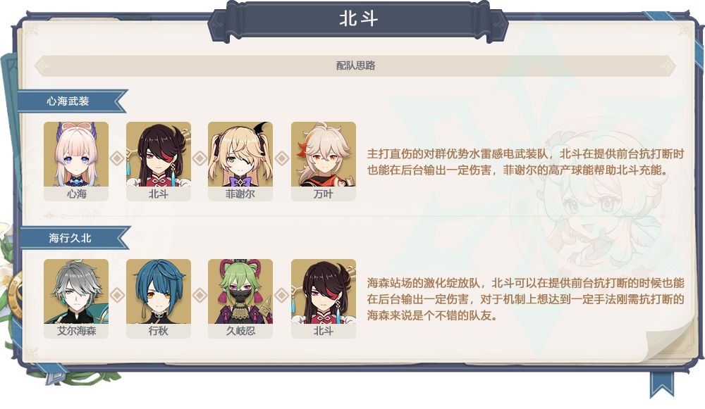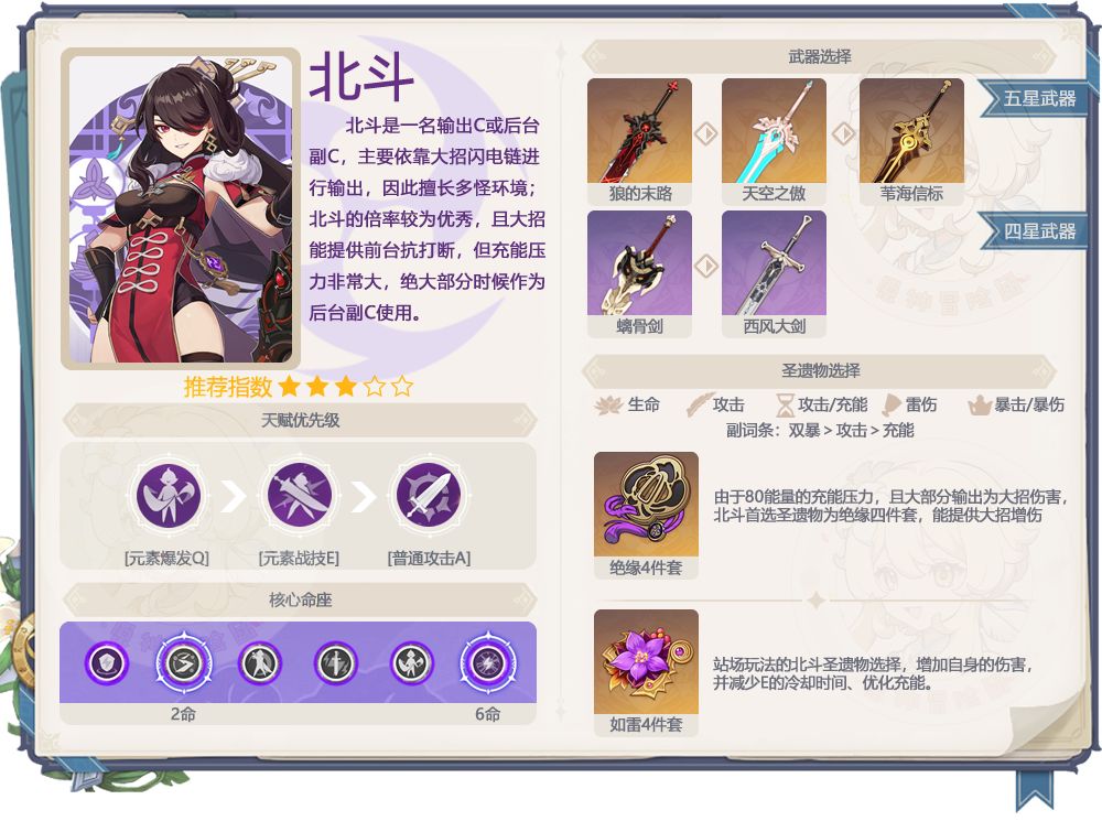 5、北斗抽取建议:北斗是唯一一个雷盾角色,作为一个后台雷是很不错的,之前基本活跃在魔王武装、超绽放这样的低成本队伍中,高配队伍很难见到她;在夏沃蕾登场后,北斗直接就是咸鱼翻身,在仆人超载队里挑起生存位的大梁,相比曾经的处境要好上不少,但也仅止于此,毕竟刚需雷火盾的也就只有仆人了,所以还是不建议特地抽两个五星角色里希诺宁是人权卡,必抽的角色,温迪属于XP抽卡的角色,强度党不推荐;四星的陪跑里面只有珐露珊是比较不错的角色,但也只适合风队使用,其他两个角色泛用性一般,整个卡池除了希诺宁以外都没有特地抽取的价值。