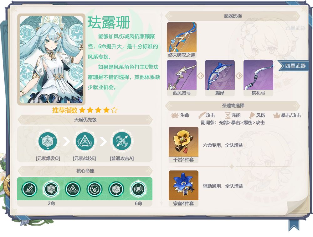 1、希诺宁抽取建议:0命希诺宁是必抽的角色,非常推荐,集减抗、增伤、治疗、跑图一体的全能辅助,0命即完整,1命提供抗打断并提高大世界跑图能力,2命给火冰水岩队伍提供约一个圣遗物主属性的数值,给雷队提供了极其罕见的减CD,2命对于主玩雷、岩的玩家非常建议抽。3命到6命非XP不推荐