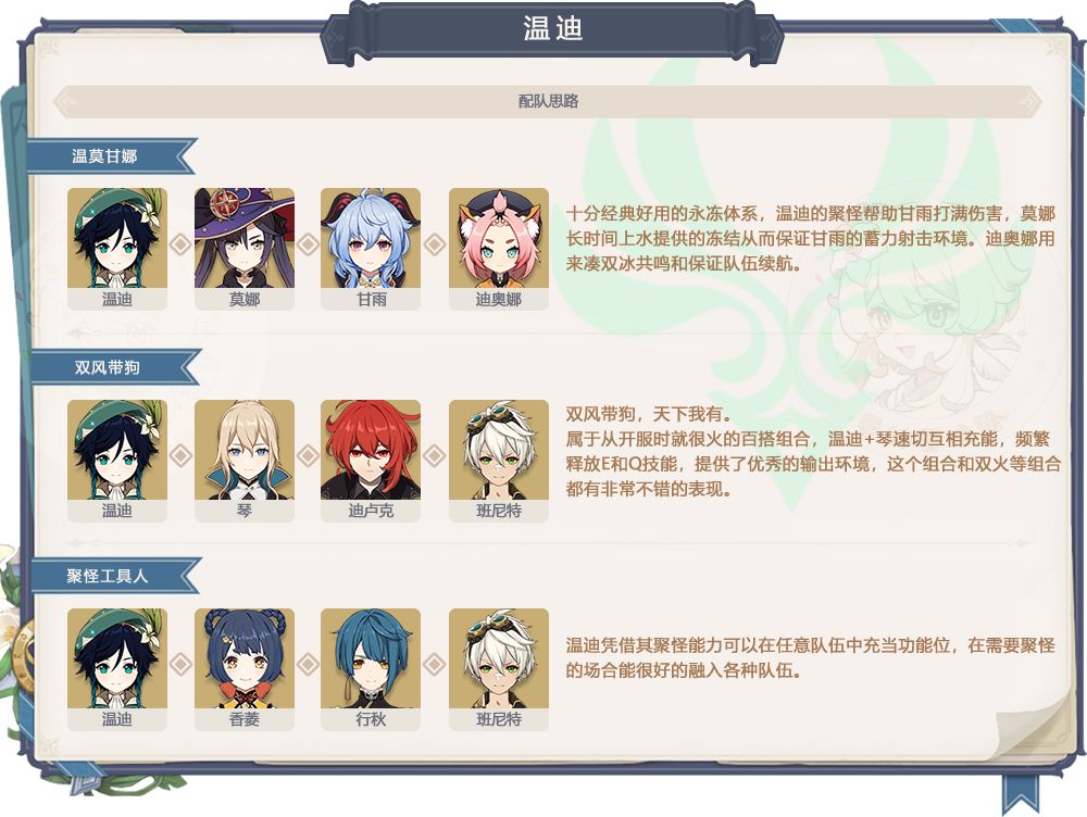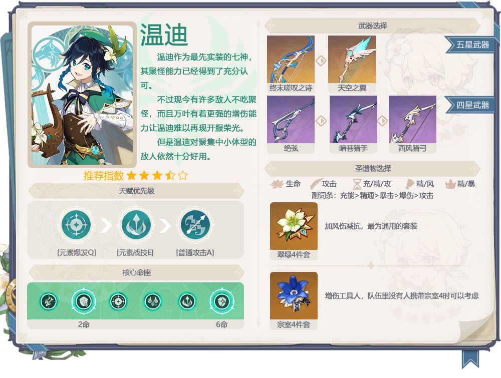 2、温迪抽取建议:作为1.0时期的角色,温迪虽然是七神之一,但是由于仅能提供强大的聚怪没有其他增益,他现在在深渊里不算好用,温迪的舒适区是超级大量普通怪的环境,这种情况下温迪的表现会非常好,但这种环境现在很少,仅在新深渊守护关卡出现,在新深渊其他关卡和老深渊的绝大多数时候都没有很好的表现几乎,就强度来说不是一个必抽角色